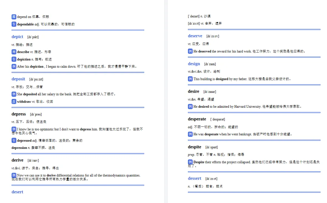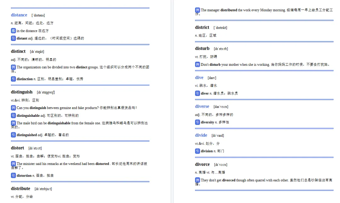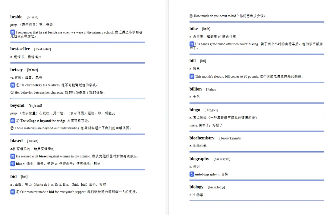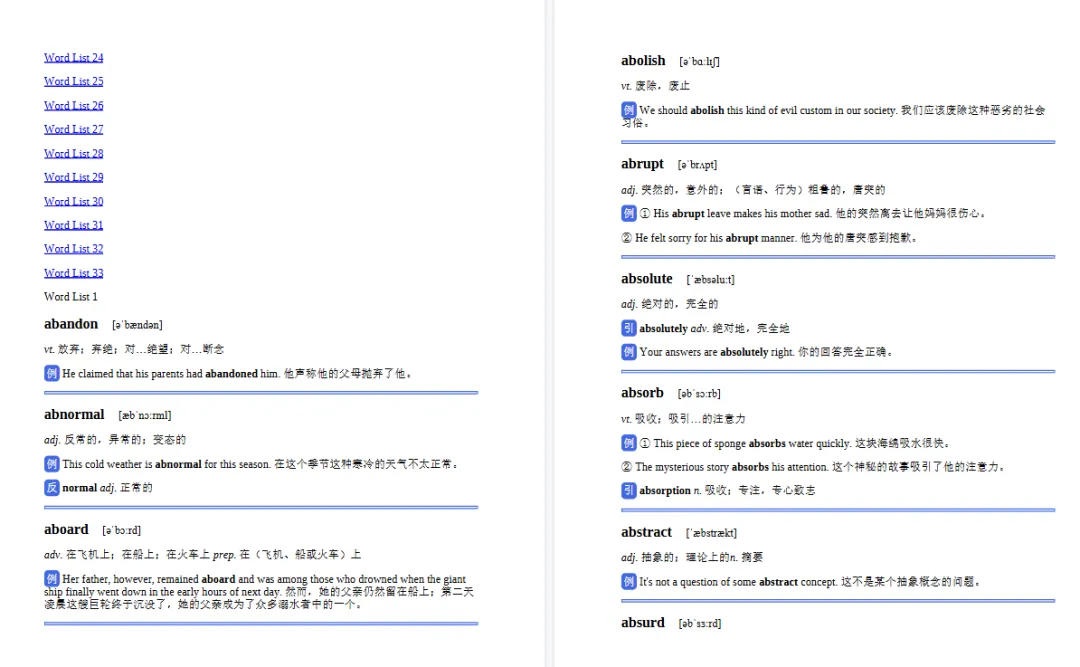 单独词汇包含词性,词义,英语关联词义,中文意思解释,还有例句方便学生理解题意!