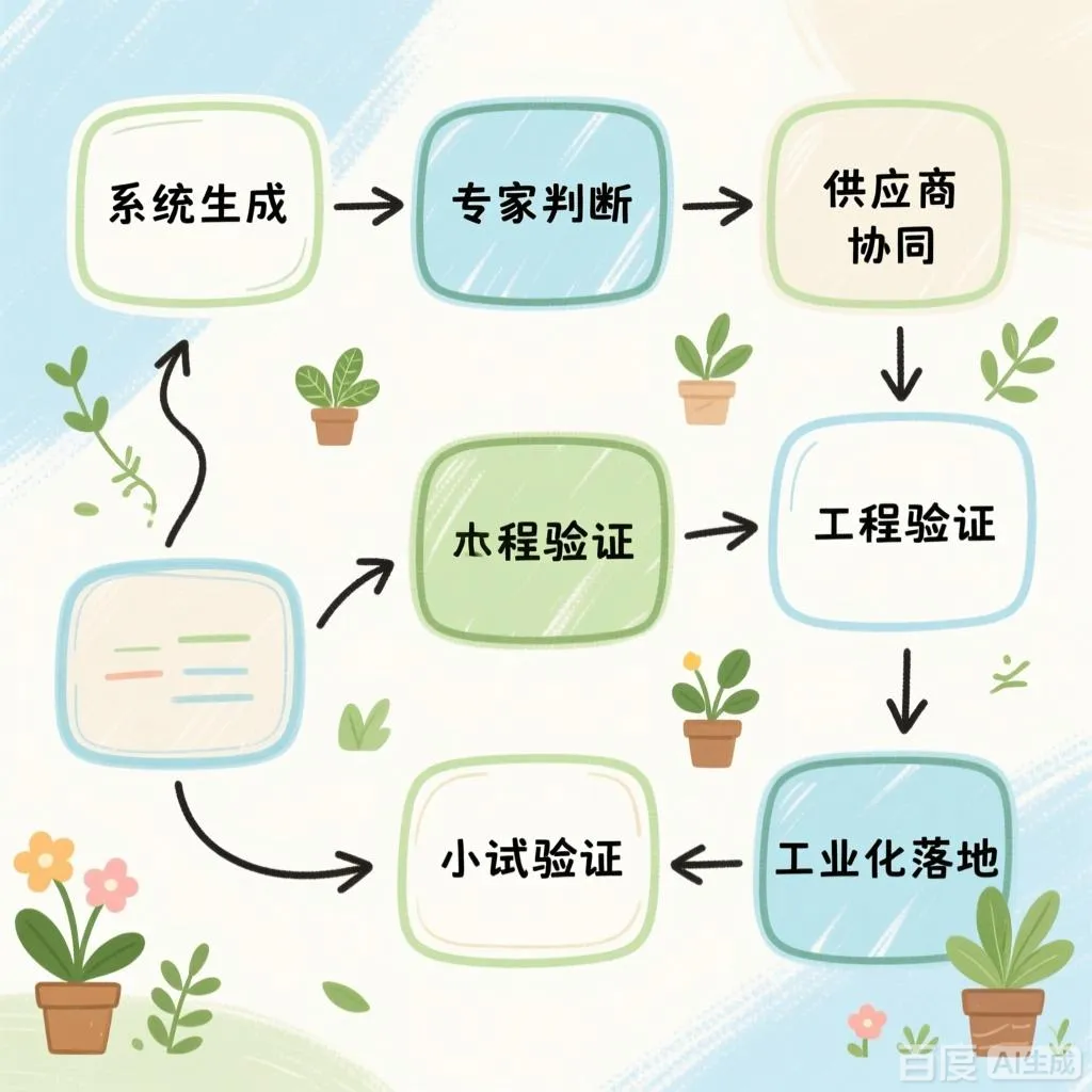 系统生成 → 专家判断 → 供应商协同 → 工程验证 → 小试验证 → 工业化落地