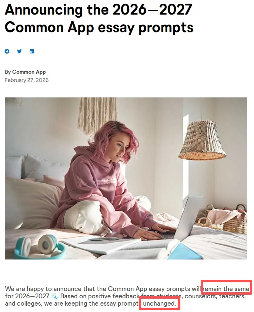 文书题目在一开年就公布,这样就给申请2027年入学的学生们提供了尽可能足够的时间去思考和规划。根据官网的消息,2026-2027年的申请,系统还是于8月1日正式开放。