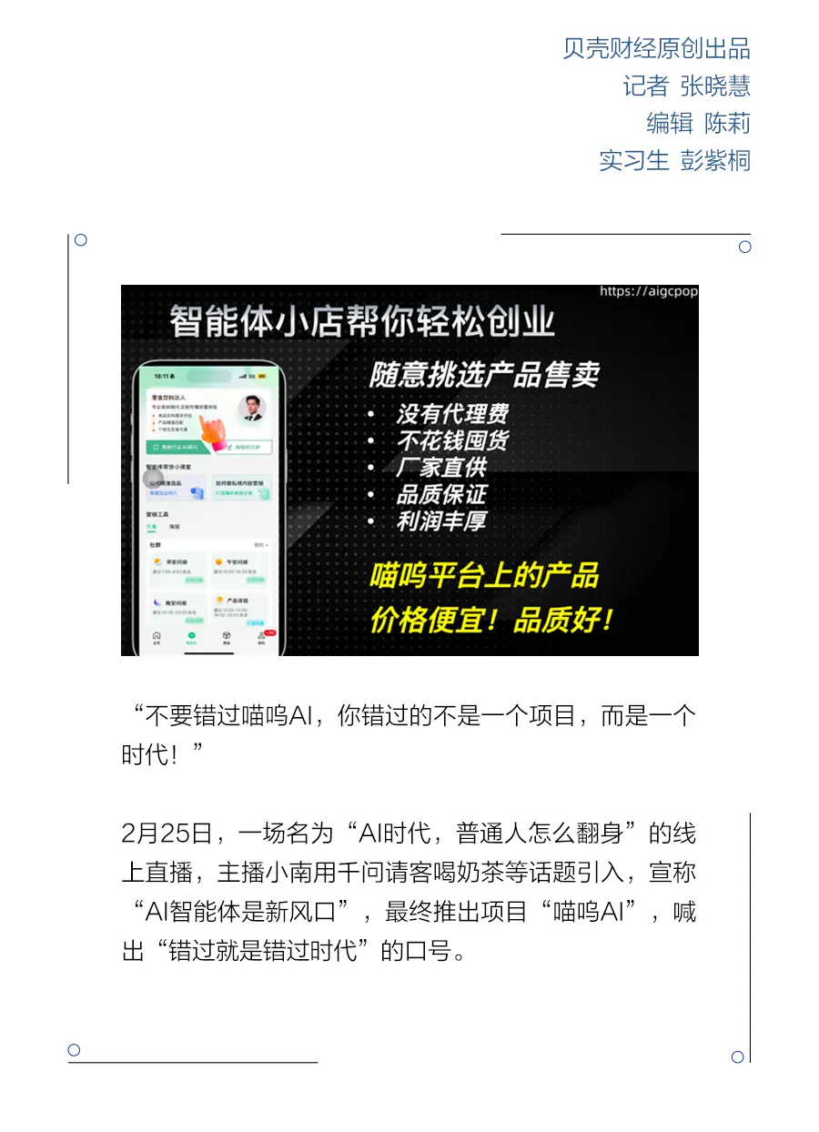 2月25日,一场名为“AI时代,普通人怎么翻身”的线上直播,主播小南用千问请客喝奶茶等话题引入,宣称“AI智能体是新风口”,最终推出项目“喵呜AI”,喊出“错过就是错过时代”的口号。