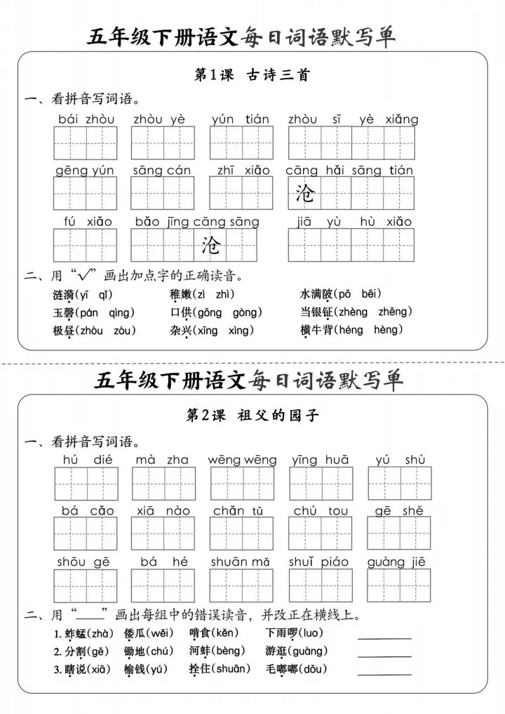 语文五年级下册《每日词语默写单》+答案,电子版可下载打印
