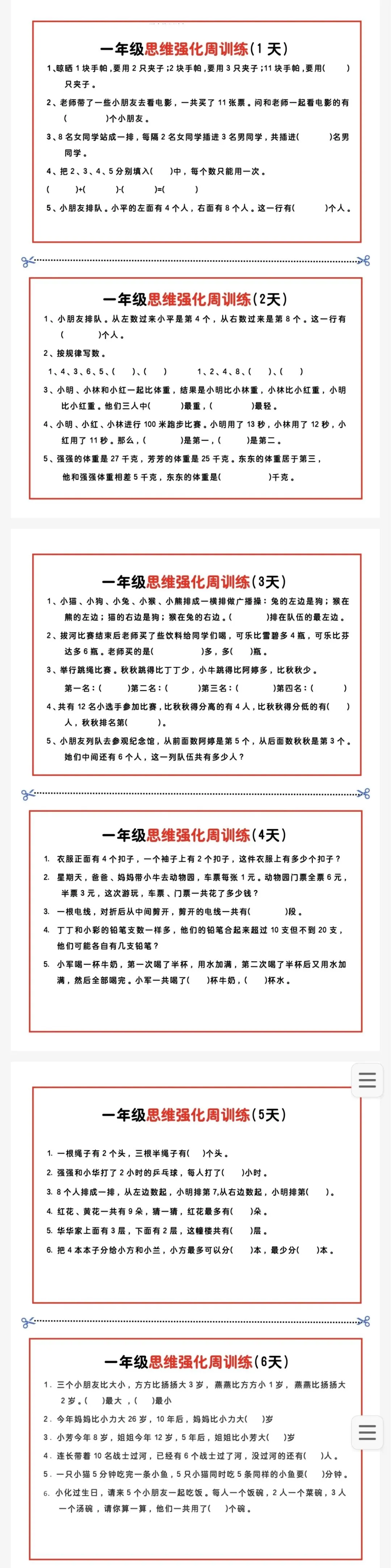 小学一年级思维强化周训练(可免费下载)
