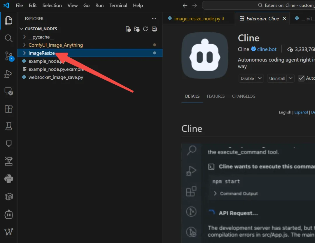 简单起见,我使用AI工具编写一个图像缩放的节点,首先使用vscdoe打开ComfyUI_windows_portable\ComfyUI\custom_nodes文件夹。