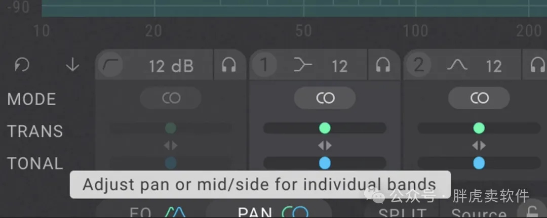连续对八个频段的瞬态和音调分量进行左/右或中/侧平移。该插件可用于空间化单声道源。