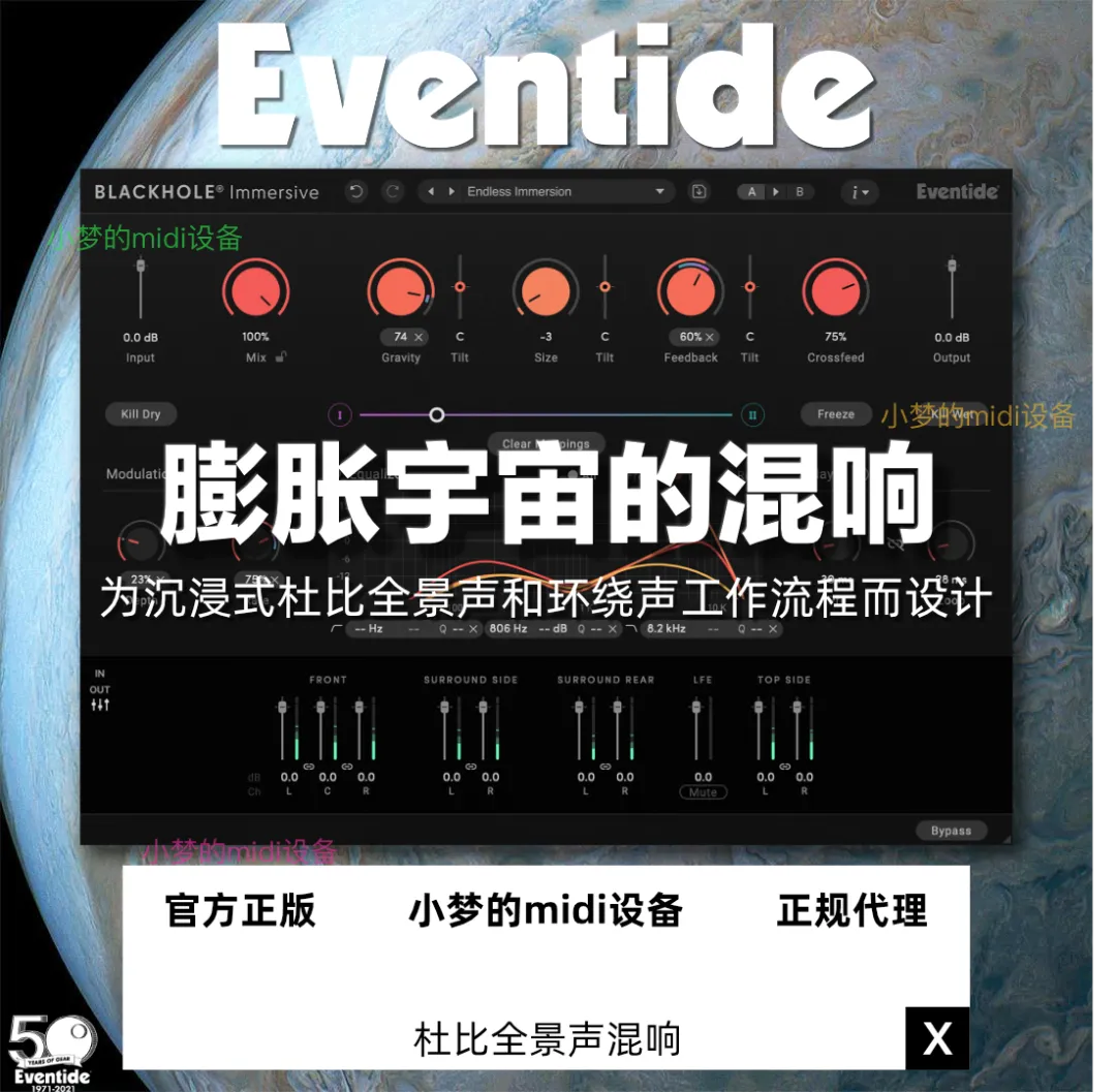 Blackhole® Immersive 专为沉浸式、杜比全景声和环绕声工作流程而设计,可将 Eventide 立体声版本的标志性声音扩展到整个沉浸式混音中。用作发送或插入时,Blackhole Immersive 既尊重又响应您精心选择的音轨定位。