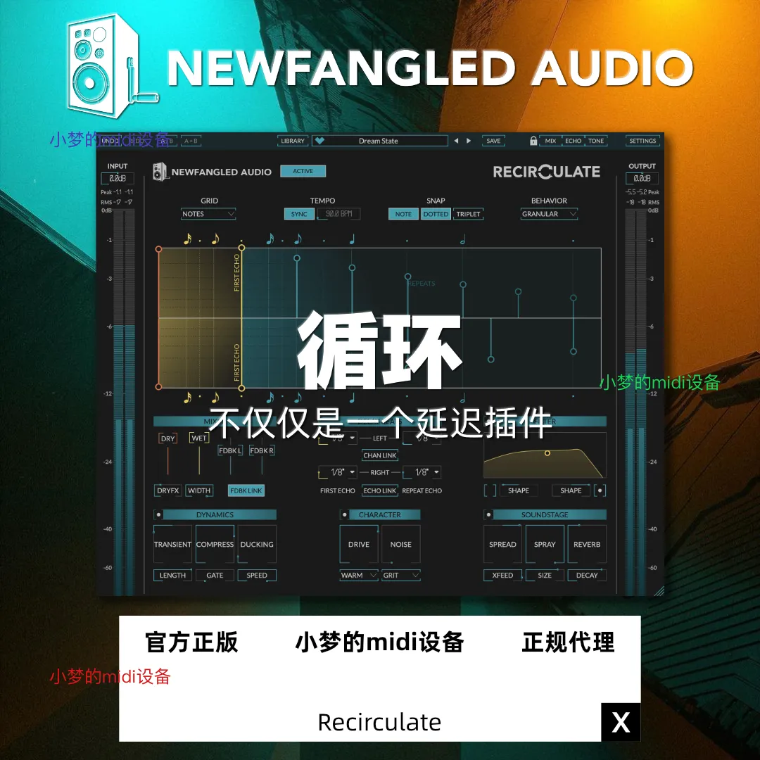 干声效果:将 Recirculate 的特性和音色融入干声路径,以整合延迟并提升整个演奏效果。