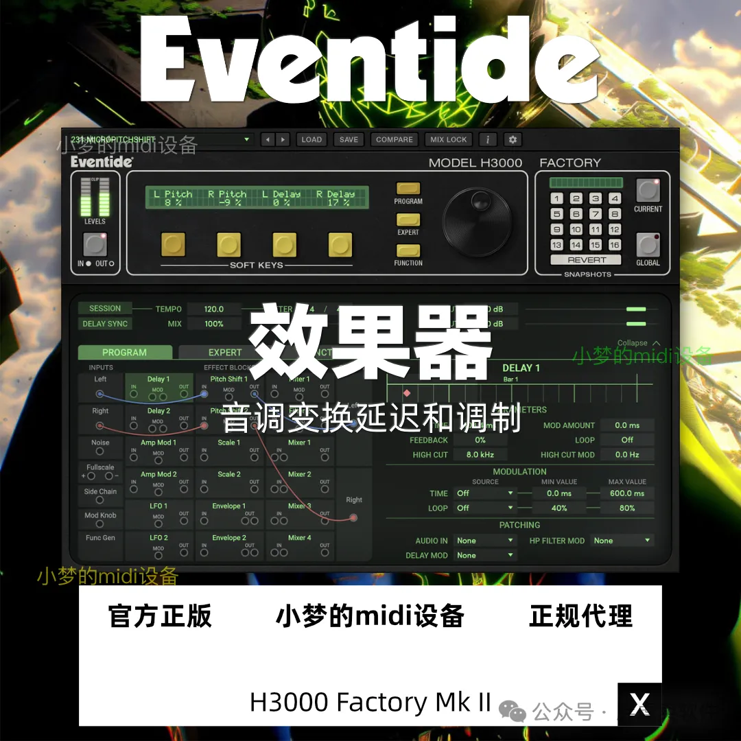 在您的数字音频工作站 (DAW) 中体验 H3000 Harmonizer® 标志性的音色,它精心模仿了原版硬件。重新探索 H3000 独特的变调、延迟、滤波和调制功能,正是这些功能让 H3000 成为专业录音棚的必备工具。H3000 Factory Mk II 拥有超过 600 个专为音乐制作和声音设计量身定制的预设,提供丰富的效果器,为您的下一张专辑注入无与伦比的创造力。