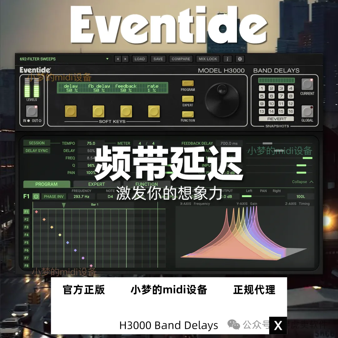 H3000 Band Delays Mk II 插件源自传奇的 H3000 Harmonizer® 录音棚处理器,是一款集延迟、滤波、立体声扩展和动态节奏效果于一体的创意引擎。H3000 Band Delays Mk II 拥有八个延迟频段,每个频段都拥有独特的电平、声像、滤波器类型、频率和 Q 值控制,只需轻点按钮,即可将原版硬件算法的灵活性和标志性音色带入您的 DAW。