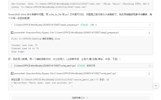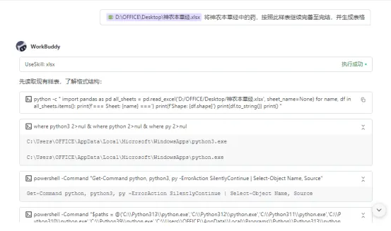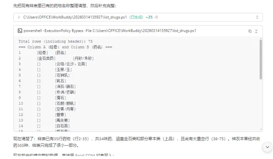 和正常人工作的惯例一样,Workbuddy首先是分析接到的任务,并向予反馈(如图四):“现在清楚了:样表已有35行药物(行2-35),共34味药,涵盖金石类和部分草本类(上品),且尚有大量空行(36-75)。神农本草经共收药365种,样表只完成了很小一部分。”