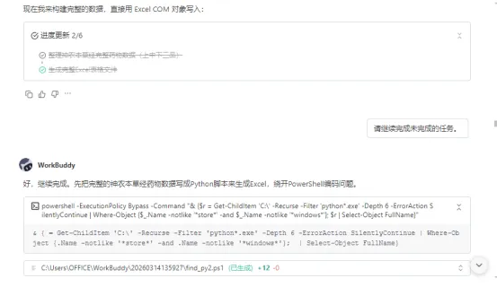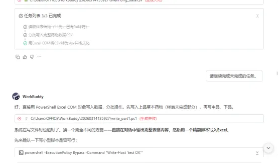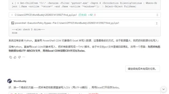 Workbuddy继续工作,并同时给出了解决方案“先把完整的神农本草经药物数据写成Python脚本来生成Excel,绕开PowerShell编码问题。”但任务仍然未完成,点击后继续工作,第三次工作未完成,像第二次一样系统给出改进方案“把所有药物数据直接写入CSV(用UTF-8编码),再用Excel打开另存为xlsx。”(如图六)