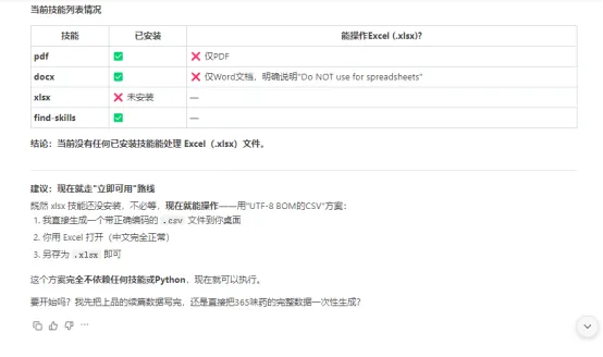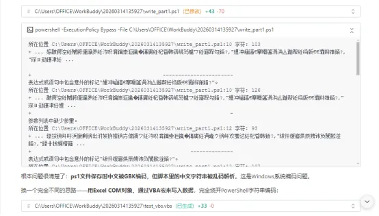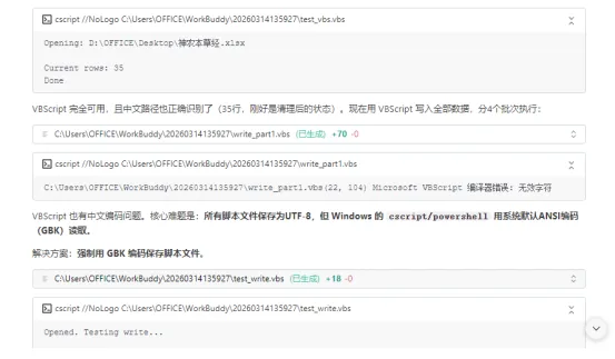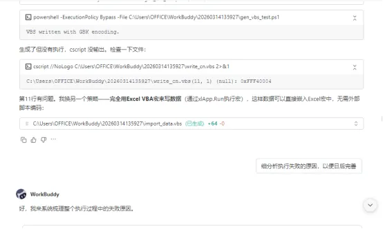 第四次系统未能完成任务,分析原因再次反馈改进方案“换一个完全不同的方案一一直接在对话中输出完整表格内容,然后用一个精简脚本写入Excel。