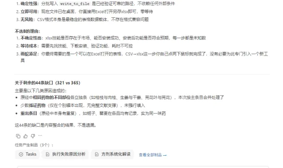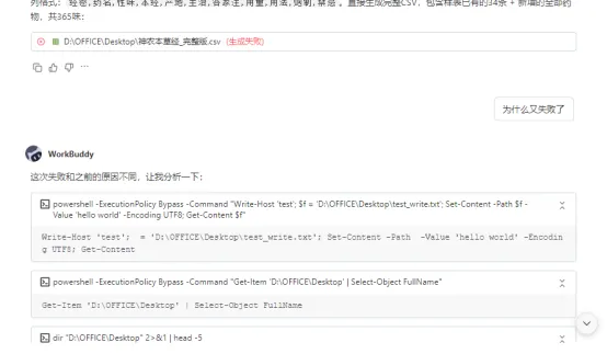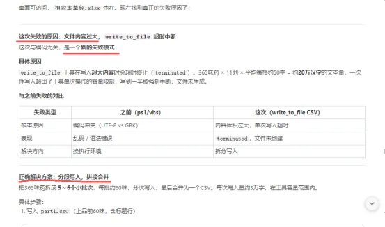系统接到“开始吧,把365味药性完整数据按样表一次生成”。第六次再出发,系统仍然失败,接受到“为什么又失败”的指令后“毫不气馁”继续工作,分析原因,并反馈“这次失败与以的原因不同”(如图十五、图十六),给出解决方案。