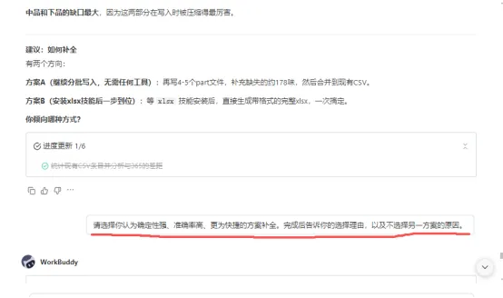 一番检查分析后反馈了两个解决方案A和B让我选择。我没有正面回答系统的问题,并让系统自己选“请选择你认为确定性强、准确率高、更为快捷的方案补全。完成后告诉你的选择理由,以及不选择另一方案的原因。”(如图十九)