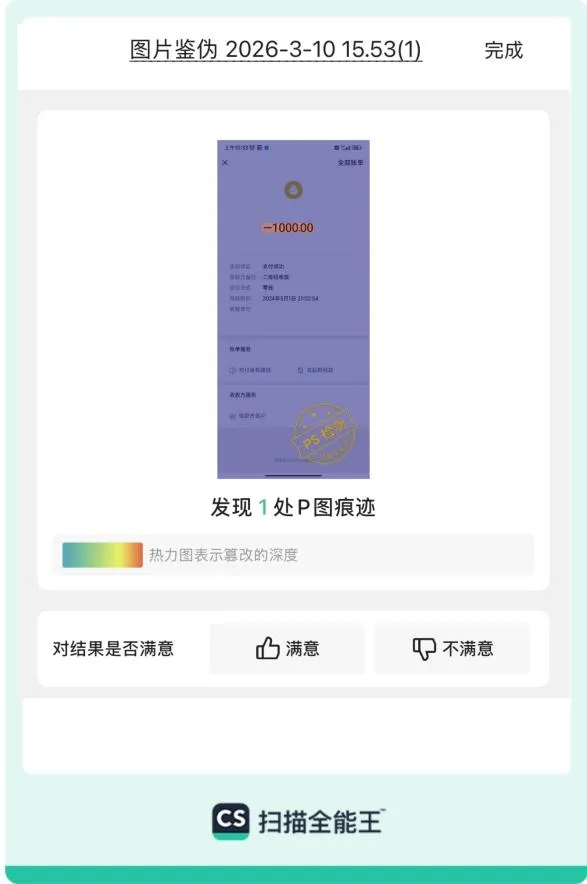 在AI造假泛滥的同时,部分不法分子还会使用PS等传统修图工具对真实图片进行篡改。扫描全能王已上线“图片鉴伪”功能,可精准检测支付截图、合同扫描件、银行流水单等文档图像的PS篡改痕迹。基于自研多模态篡改检测大模型,扫描全能王能够在检测到异常时输出可定位的篡改区域与证据提示。目前,该技术能力已通过中国信通院“文档图像篡改检测平台能力完备性”认证,为资料核验、票据报销、合规审查等场景提供安全保障。