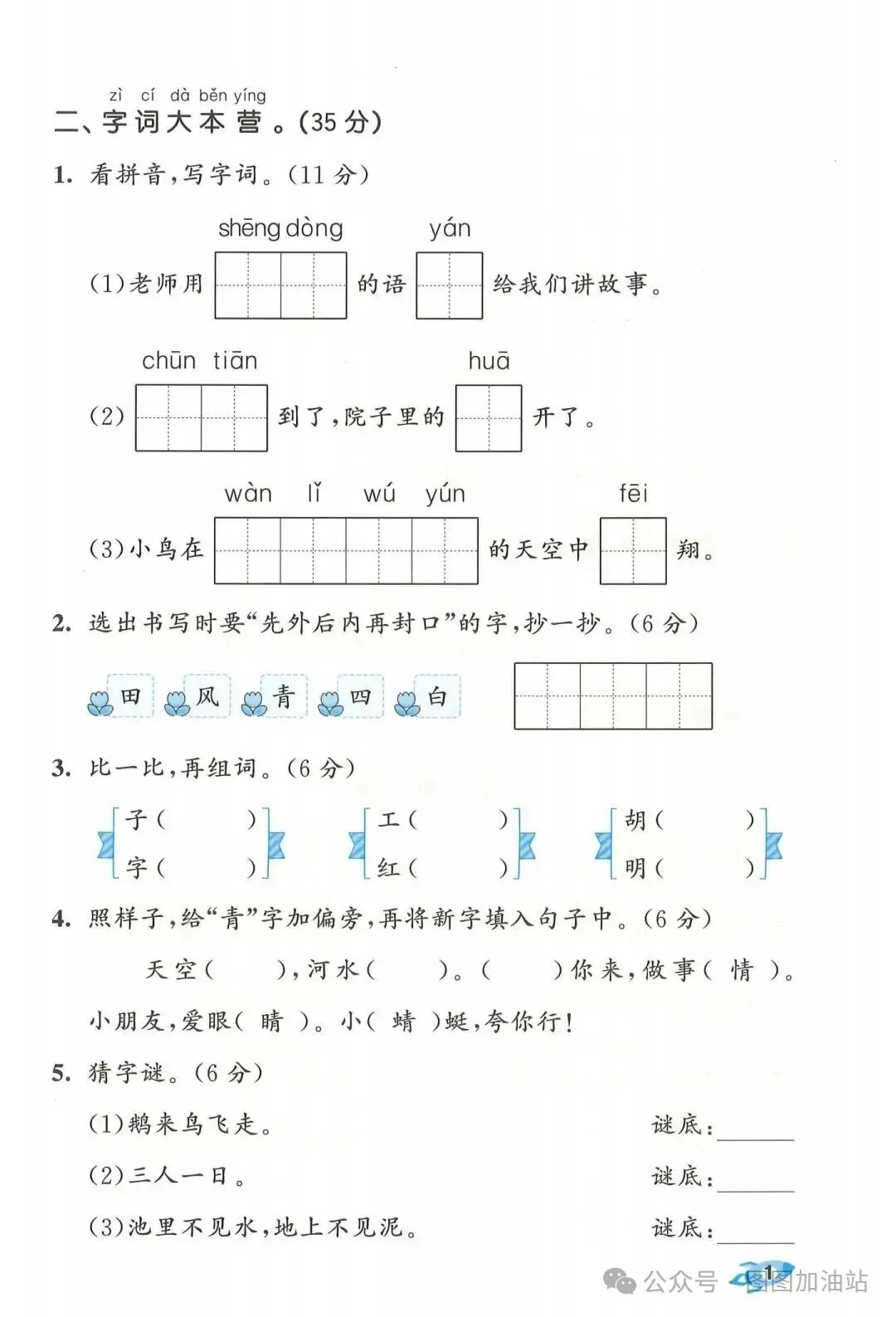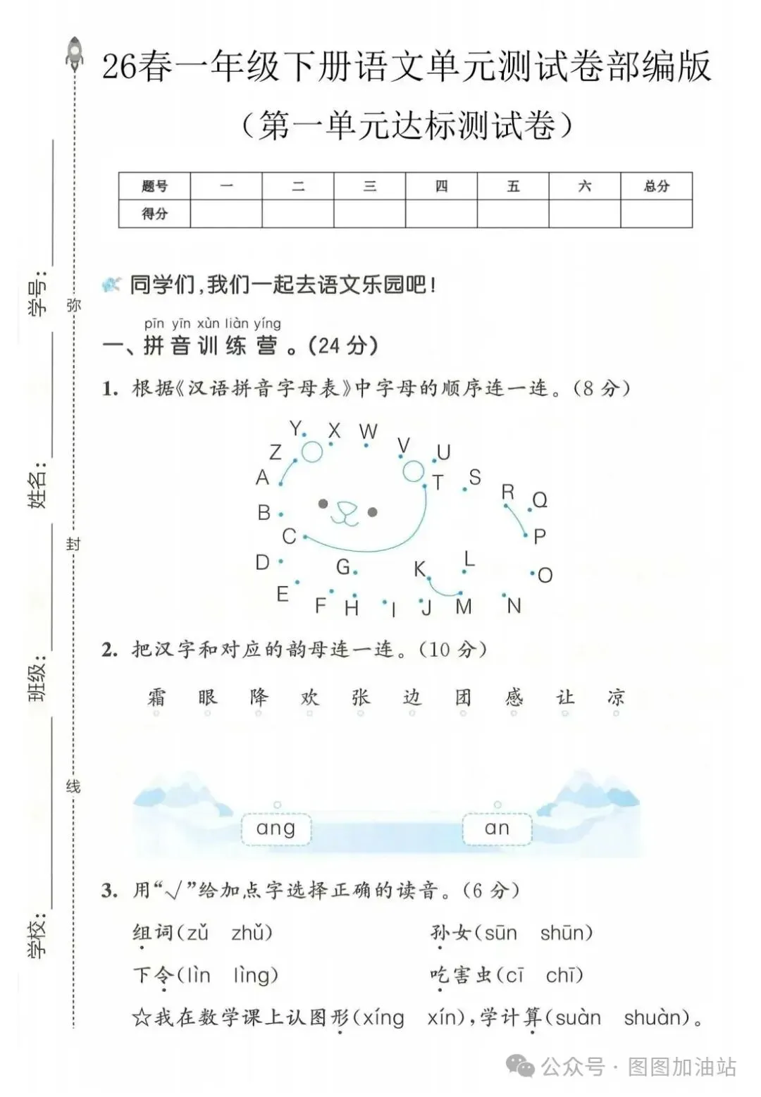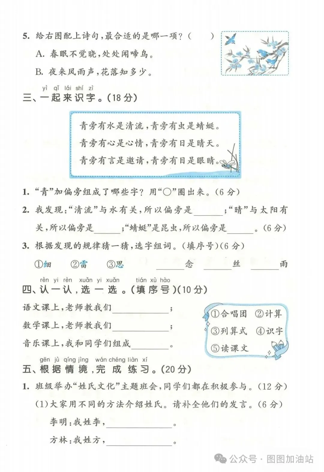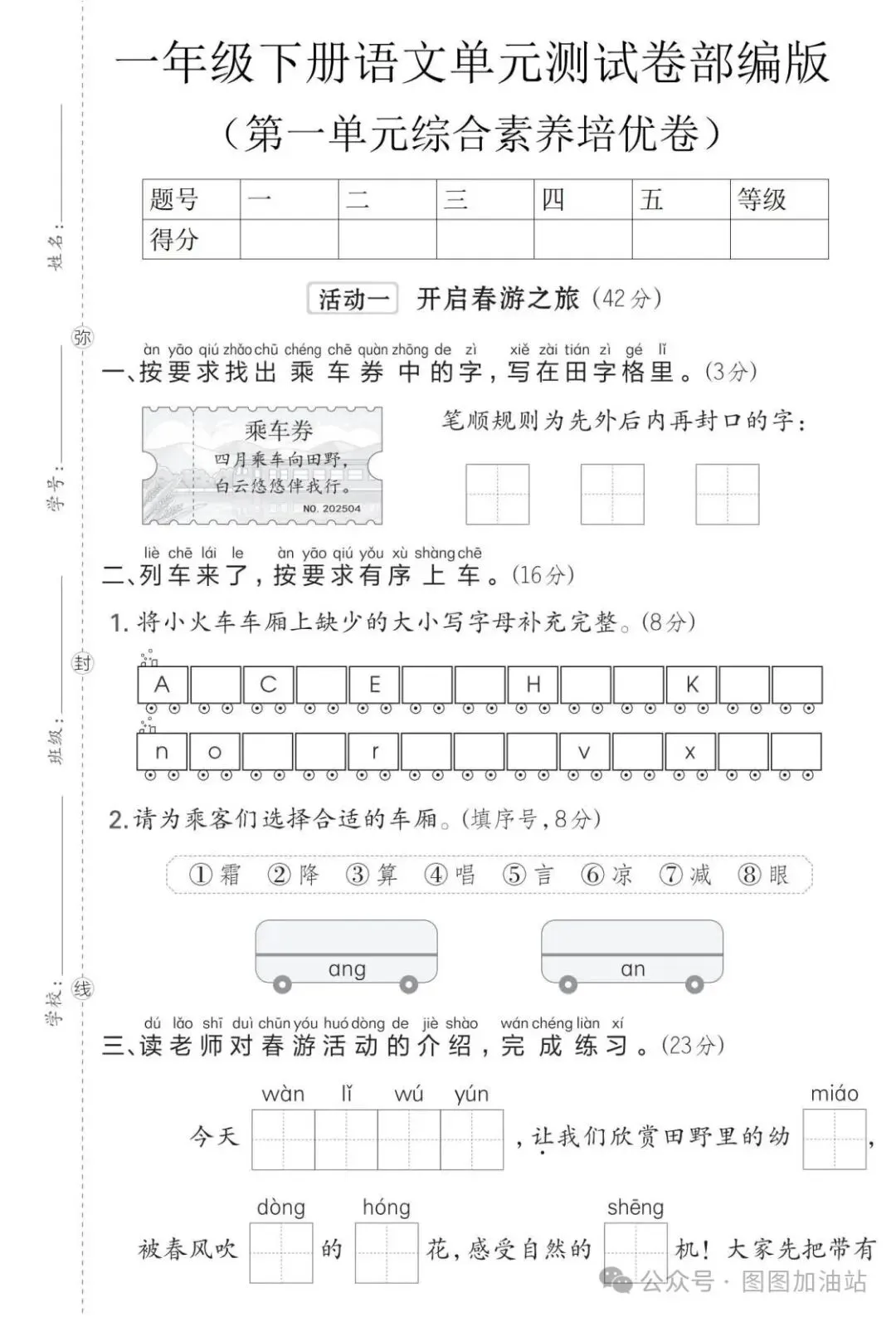 人教部编版一年级下册语文《第一单元测试卷》,共5套,含答案,可下载打印