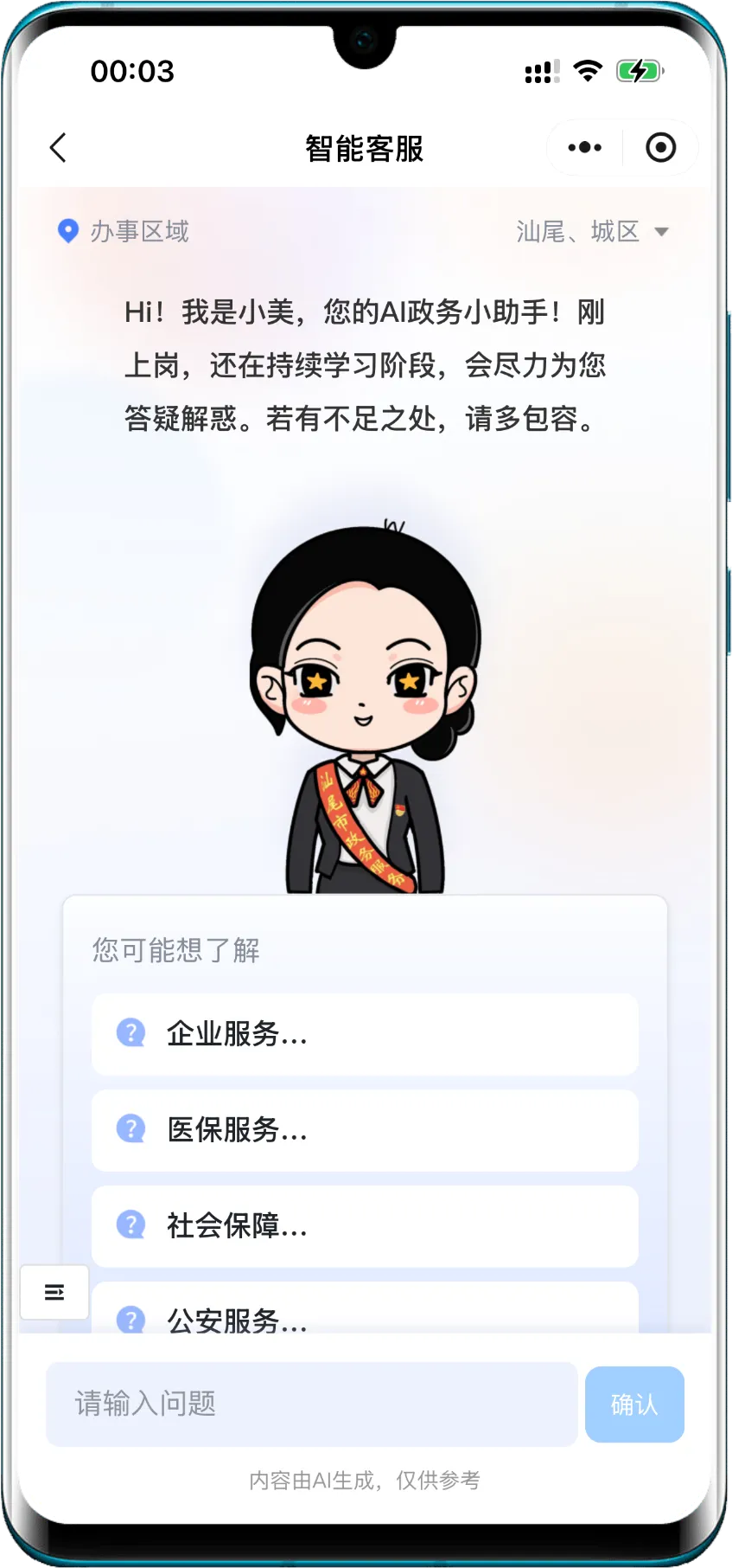 在服务的另一端,智能导办的应用正悄然改变着群众的咨询体验。智能客服“善小美”已覆盖善美政务、善美店小二、善美村居等平台,聚焦于高频政务服务场景,涉及企业开办、社保医保、公积金、人口户政等与民众生活和企业发展息息相关的重点领域,支持群众以口语化方式查询办事指南、政策解读、流程指引等,实现“问即所得 一次告知”,为群众提供“24小时不打烊”咨询服务,累计回复提问7.3万余次,完成从传统人工咨询到智能交互的全新升级。