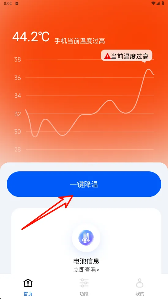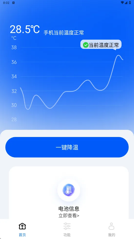 打开APP首页,顶部直观显示当前手机温度点击蓝色「一键降温」按钮,系统自动扫描发热源,关闭不必要的后台进程。