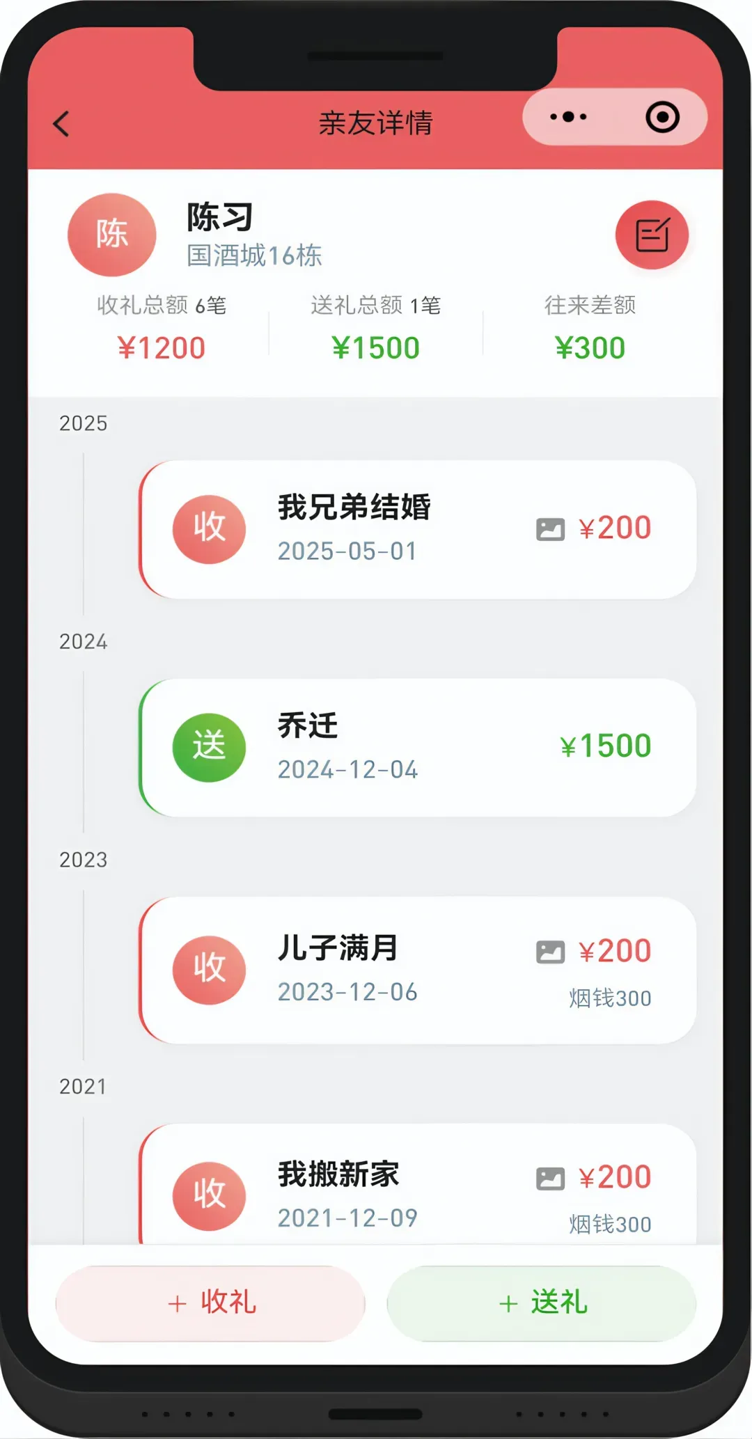 · 录入送礼信息仅需10秒,系统自动统计与亲友的收支差额显示“我差别人”或“别人差我”的金额,支持查看详细往来记录。
