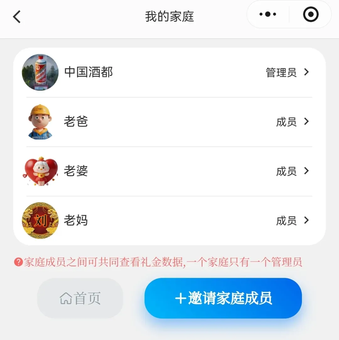 · 主账号可邀请家庭成员(父母、配偶、子女等)共享数据,同步查看礼簿信息,主账号拥有解散和删除成员权限。