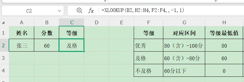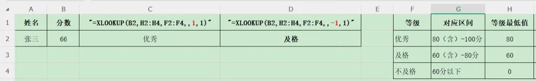 第5个参数:匹配模式,0为精确匹配,不一样就报错;1为区间里取大数;-1为区间里取小数。(比如66在60~80的区间,如果参数选1,结果就是返回80对应的优秀;如果参数选-1,结果就是返回60对应的及格)。参数会对结果影响巨大,可以写好公式后举例验证,保证无误