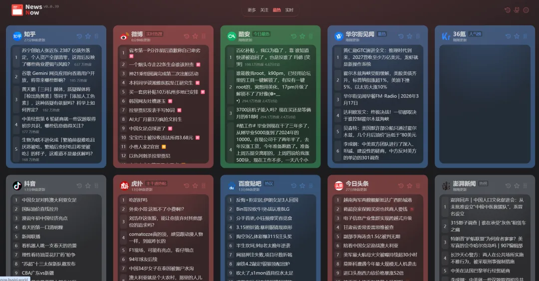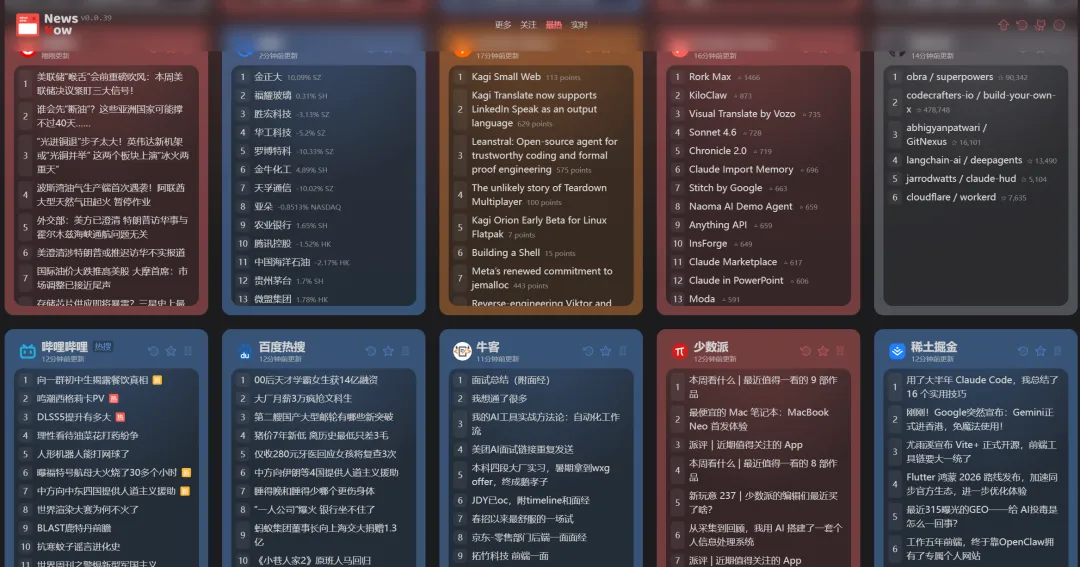 NewsNow聚合了多个平台的新闻,汇集全球热点新闻,让我们能够一目了然的看到不同平台的热榜