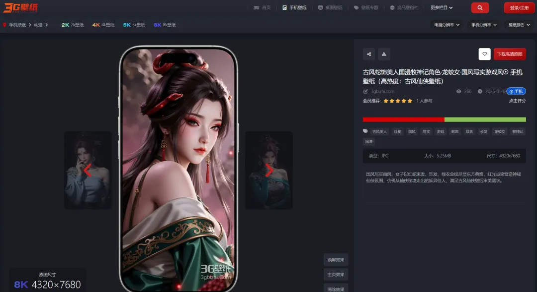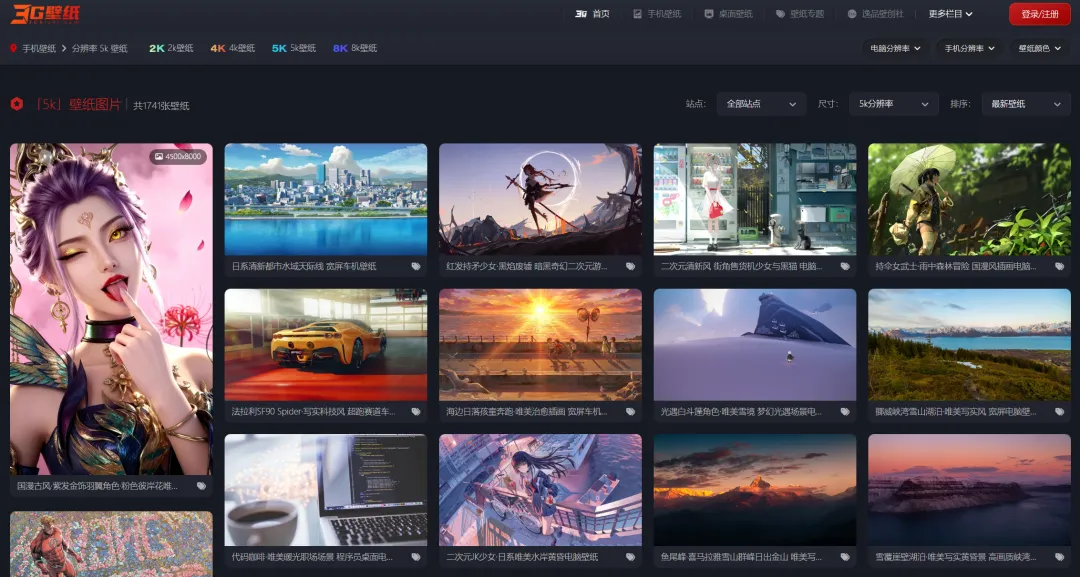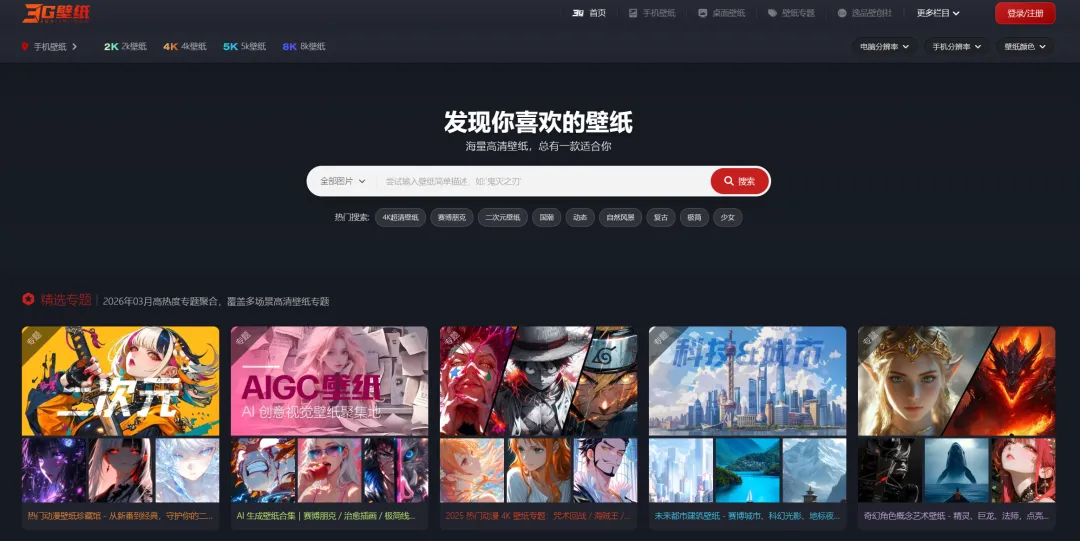 3GBizhi拥有海量的高清壁纸资源,涵盖了各种风格和类型,如4K,5K,8K超清壁纸、赛博朋克风格、二次元壁纸、国潮动态壁纸等