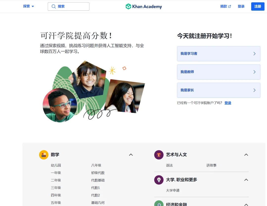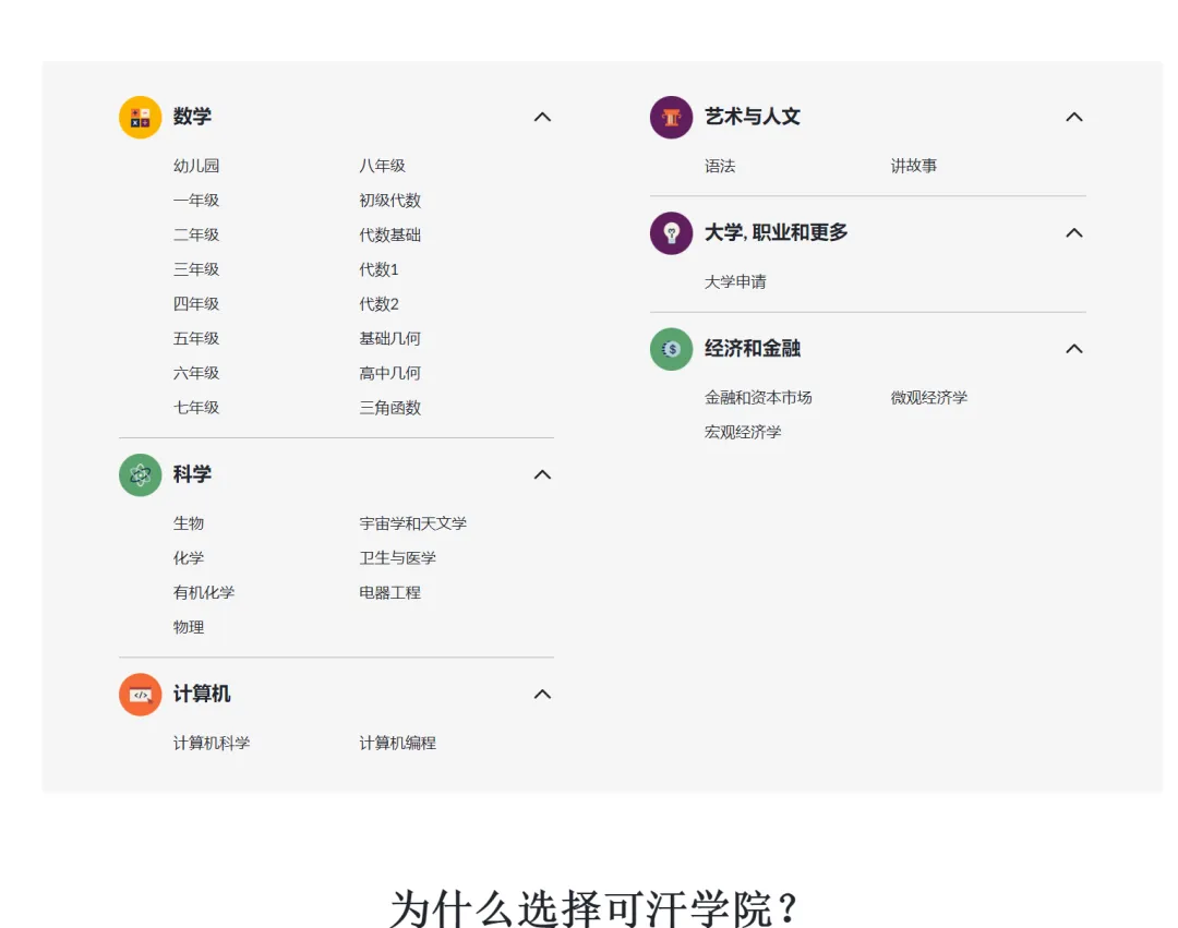 Khan Academy 中文版提供了涵盖数学、科学、计算机科学、历史、艺术史、经济学等多个学科领域的课程