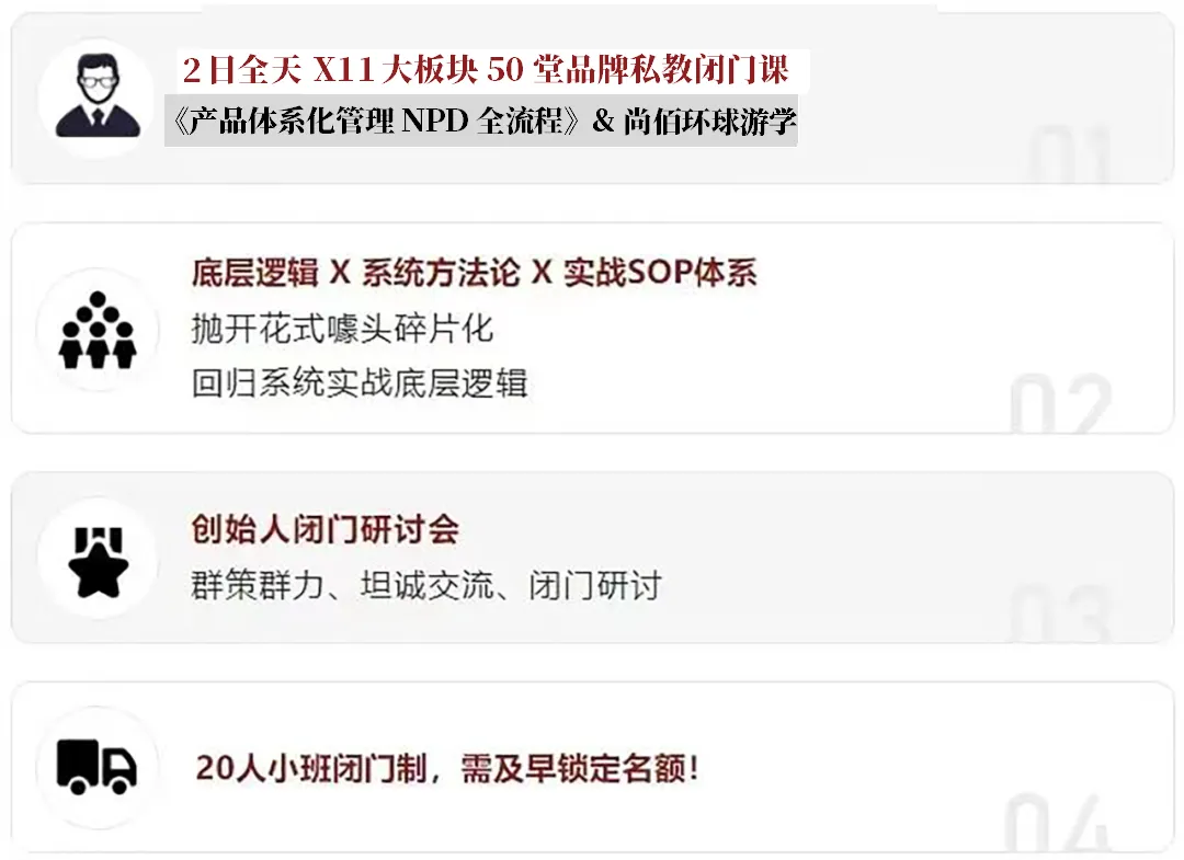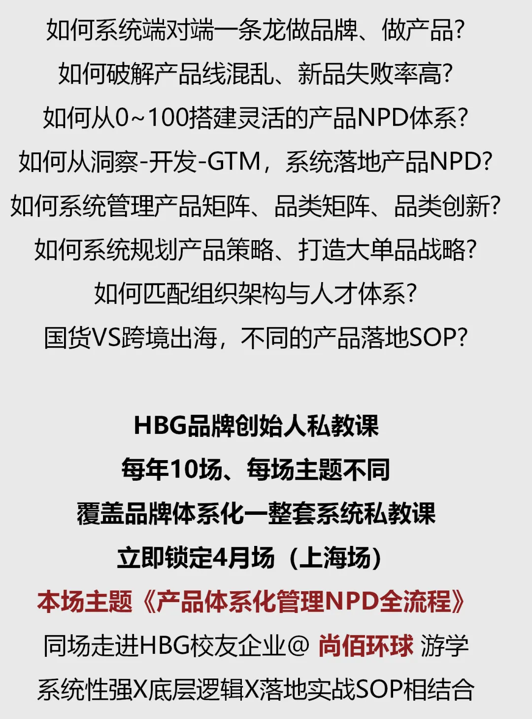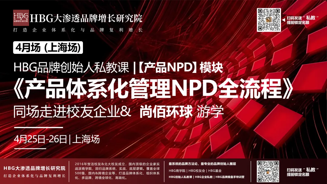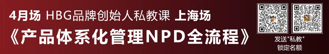 关于品牌体系化、产品NPD体系化的更多干货与实战落地SOP,在4月场HBG私教课《产品体系化管理NPD全流程》&尚佰环球游学 当中,2日全天小班私教,从底层逻辑到落地SOP,进行系统拆解,立即发送【私教】关键词给到老师vx(HBG_keke)或者(bmccr2023)锁定有限名额。
