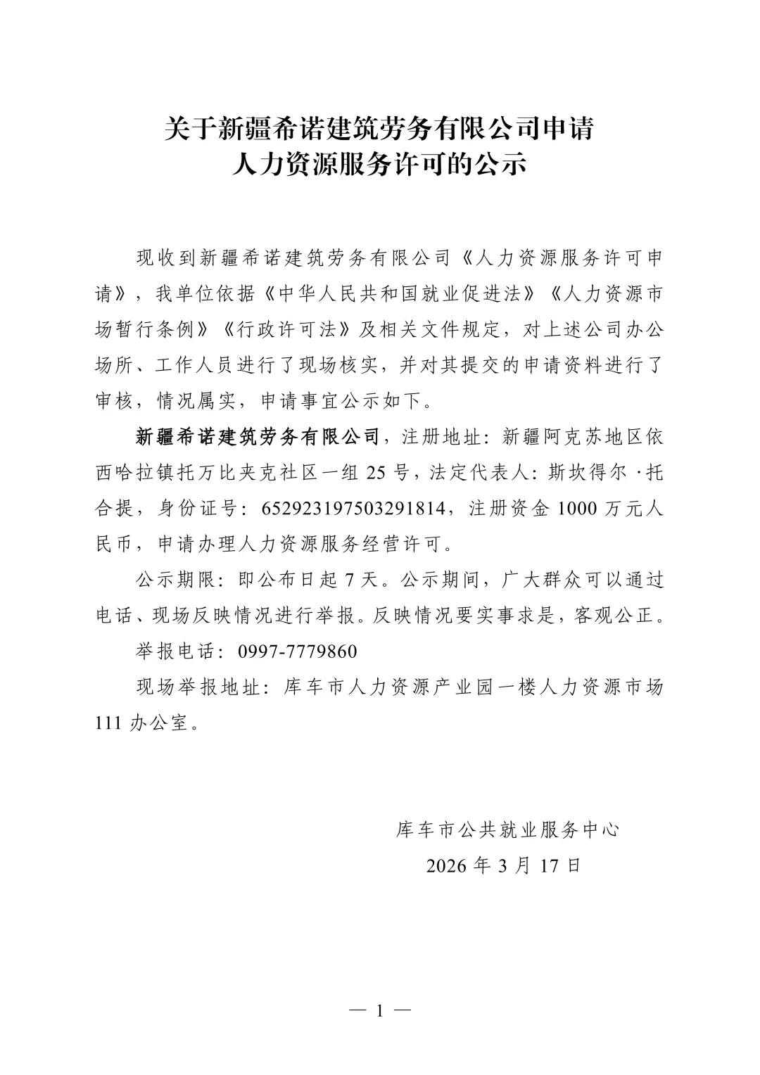关于新疆希诺建筑劳务有限公司申请人力资源服务许可的公示