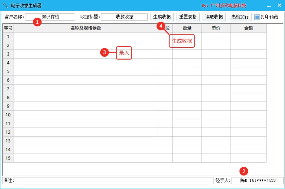 电子收据生成器是专为个体工商户、小店主打造的免费电脑工具,无需复杂安装,打开即可使用,核心围绕 “高效、规范、便捷” 设计,能自动完成金额计算、大写转换、编号生成等操作,还支持打印预览输出,完美解决手写收据的各类痛点,让收款、记账、存档全流程更顺畅。