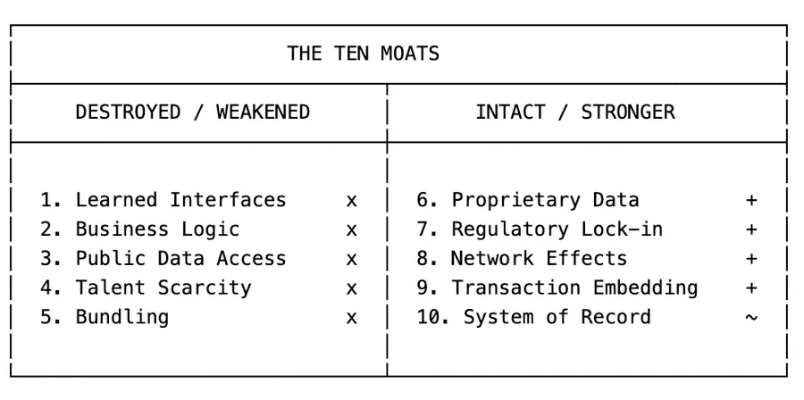 以上述软件公司为例,我认为这里存在十种不同的护城河,如今LLM正在瓦解这些护城河中的一部分,而对另一部分则无法造成任何冲击。在细节上理解哪些地方受到冲击、哪些地方安然无恙,正是这场行业博弈的关键。