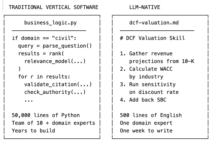 业务逻辑正在发生一场大迁徙——从只有专业工程师才能写的代码,变成了任何懂行的人都能写的Markdown文件。过去垂类软件公司花上几年才跑通的业务逻辑,现在几周就能复刻。这道“工作流护城河”正在以惊人的速度瓦解。