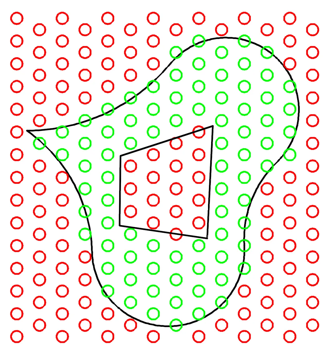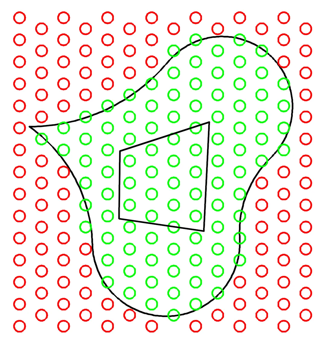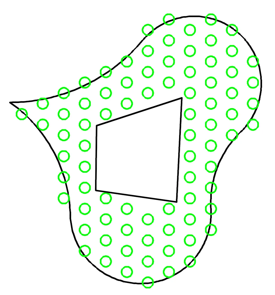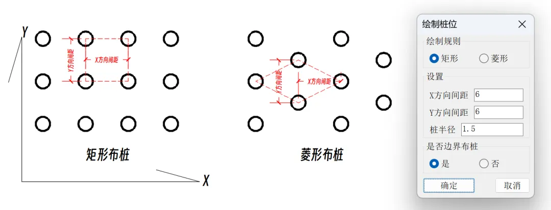 ➤ 自动布桩。依用户设置的 UCS 坐标系,按 “先沿 X 轴成排、每排沿 Y 轴” 顺序布桩;需用户选择多段线(LWPOLYLINE,支持曲线),插件自动计算与 UCS 的 X、Y 对齐的包围盒,再按用户输入的布桩形式、间距、桩半径参数布桩,桩位绘于 “cjp-zj-pos” 图层;结果中,多段线范围内桩位为绿色,范围外为红色。
