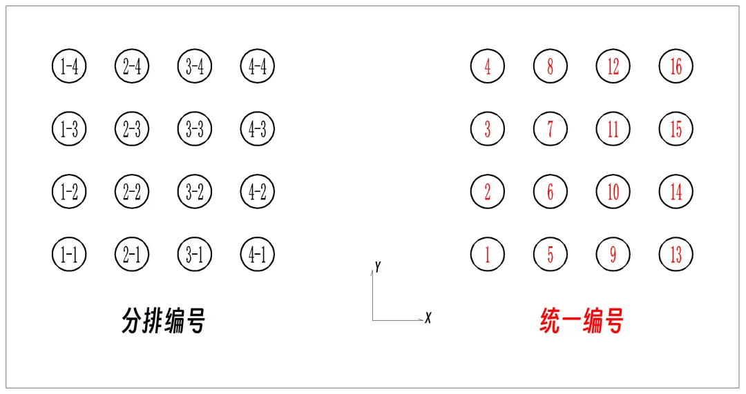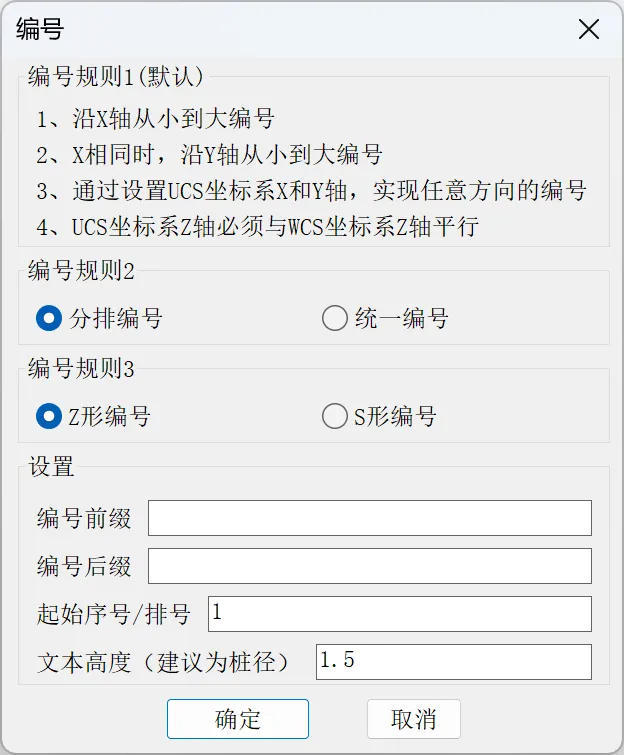 ➤ 桩位编号。依 UCS 坐标系,支持 Z 形(X 轴递增,X 相同则 Y 轴递增)和 S 形(X 轴递增,偶数排 Y 轴递增、奇数排 Y 轴递减,排数从 0 起)编号;可设编号前缀、后缀及统一或分排编号,编号绘于 “cjp-zj-num” 图层。