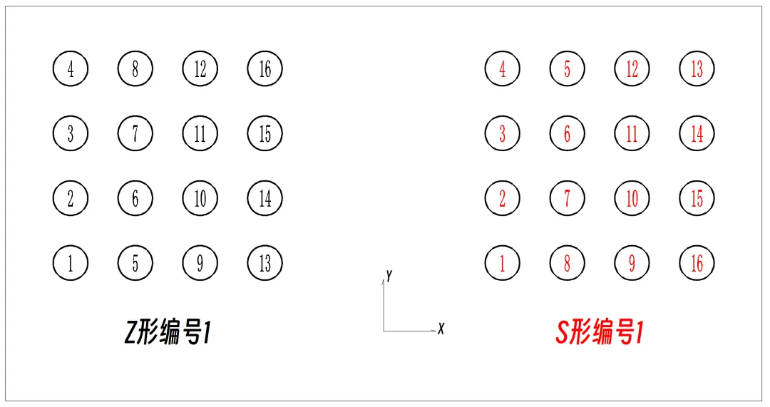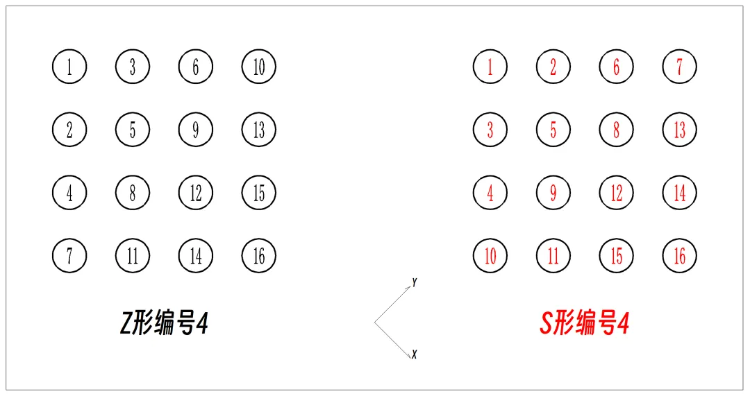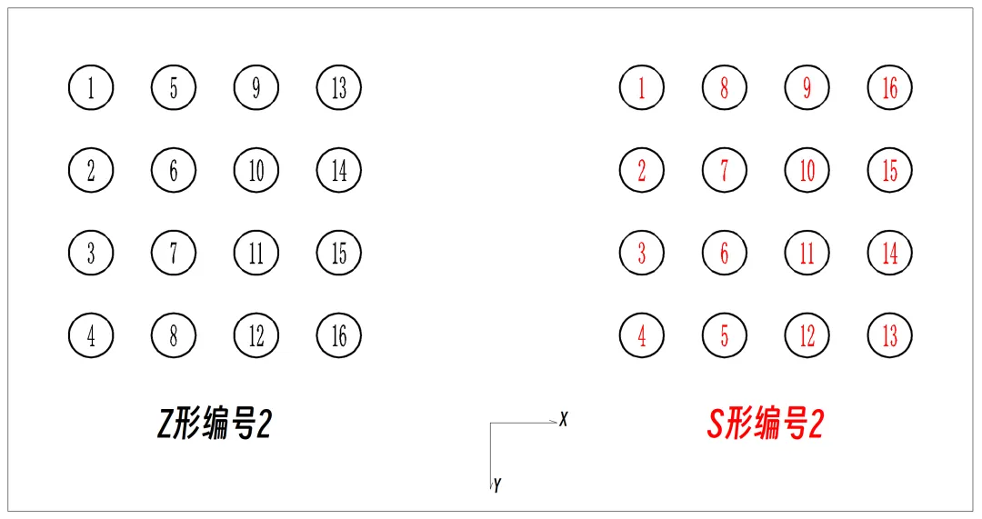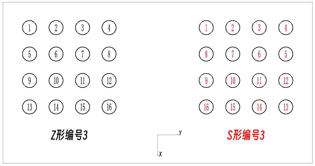 ➤ UCS坐标系和编号规则的关系如系列下图,图中左侧为Z形编号,右侧为S形编号,中间为UCS坐标系的定义。