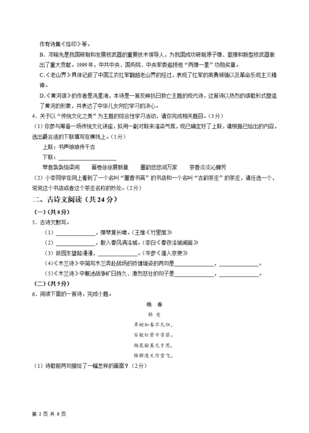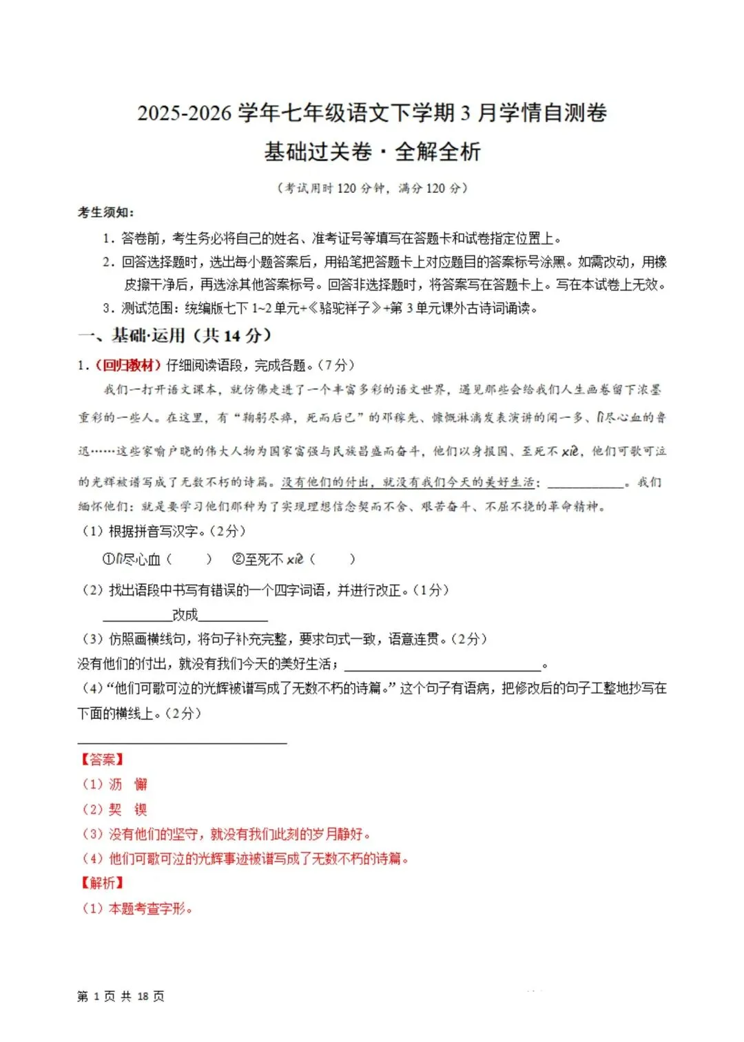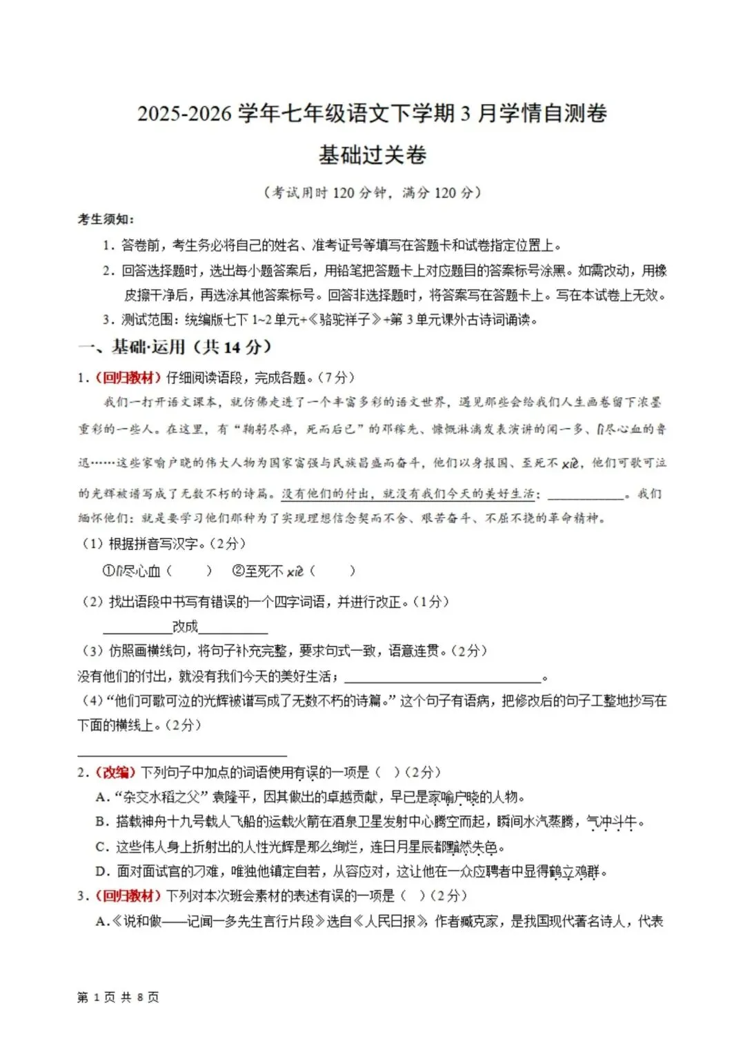 2026年春新版七年级下册人教部编版语文第一次月考试卷基础过关卷(3月学情自测卷),完整电子版含答案可打印
