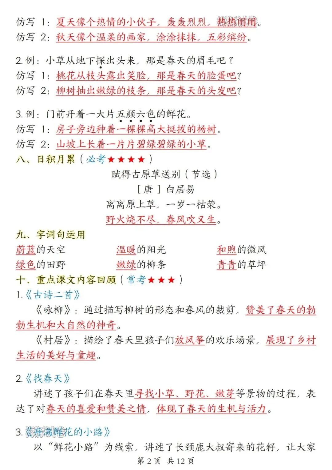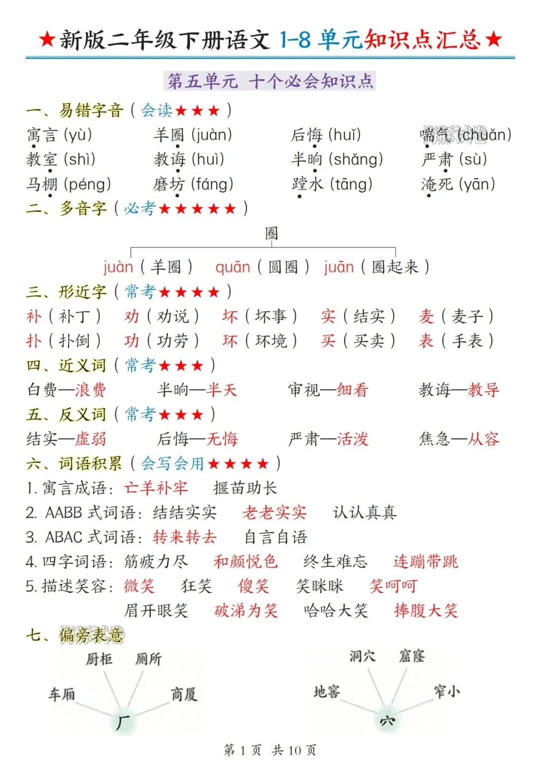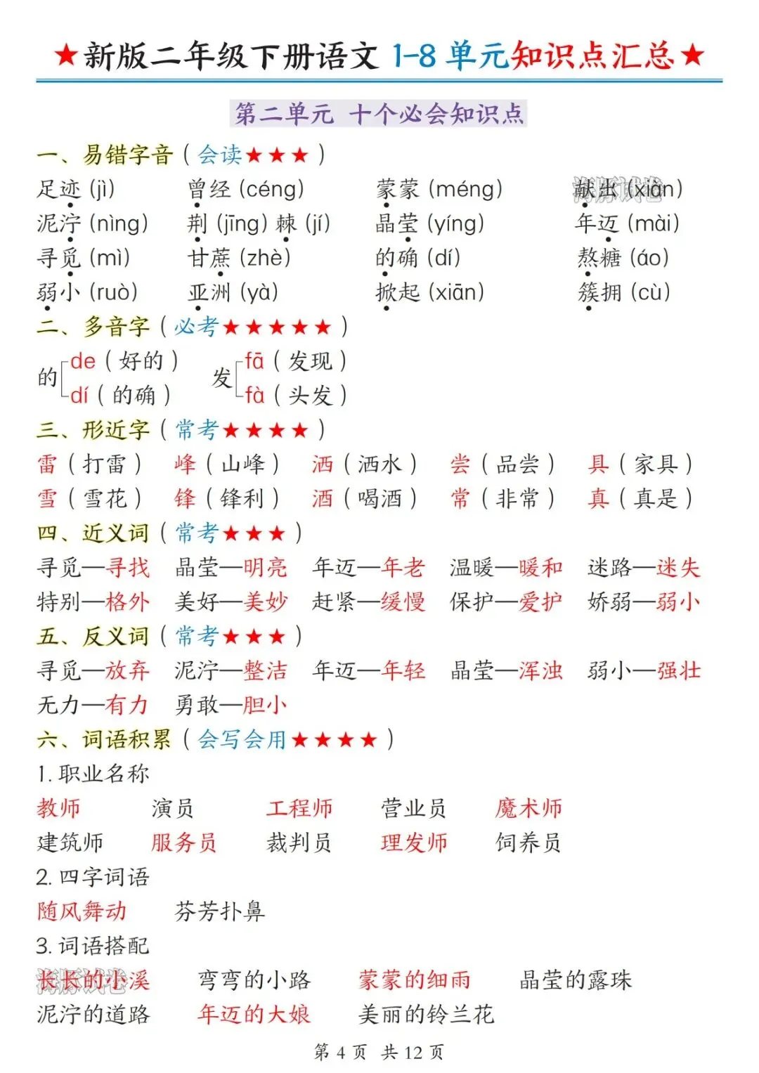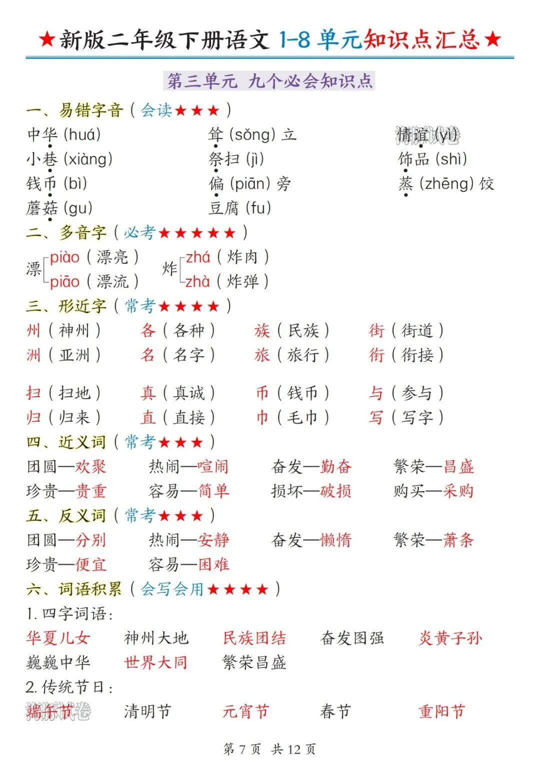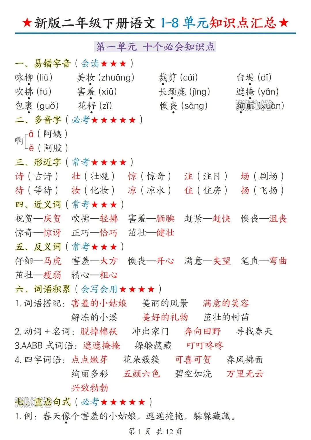 二年级下册语文1-8单元知识点汇总(电子版可打印)