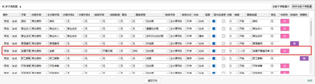 也就是说,当你配置好某个子表的图表类型、字段和样式之后,可以先点击 预览,看一下生成效果是否符合预期。如果需要调整,比如换一种图表类型、修改颜色或者调整字体,也可以马上修改,再重新预览。