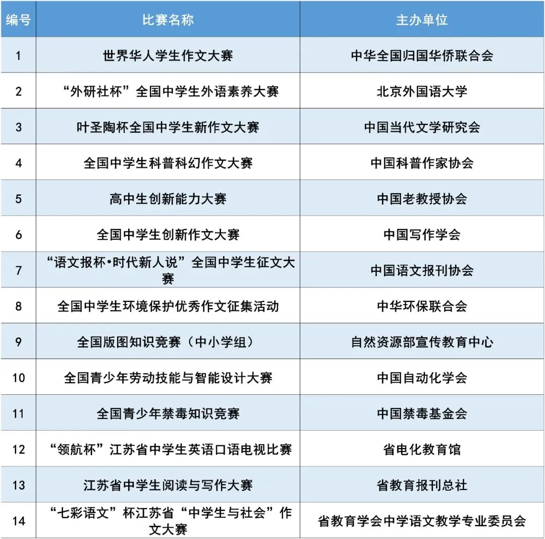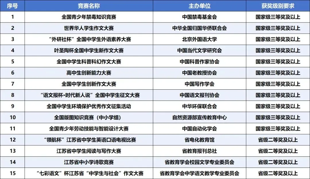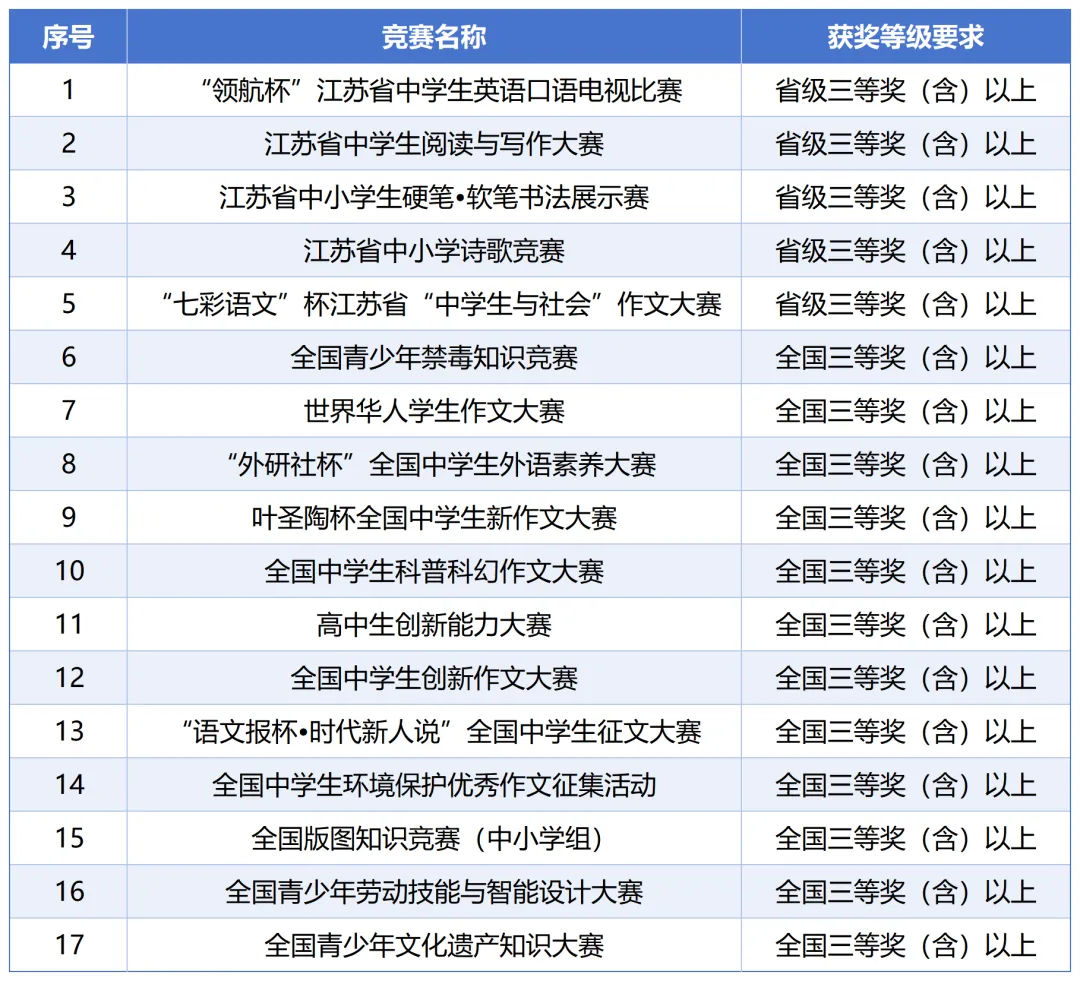 高中阶段在“外研社杯”全国中学生外语素养大赛全国总决赛(北京外国语大学)、叶圣陶杯全国中学生新作文大赛决赛(中国当代文学研究会)、全国中学生科普科幻作文大赛全国总决赛(中国科普作家协会)、高中生创新能力大赛全国决赛(中国老教授协会)、全国中学生创新作文大赛全国总决赛(中国写作协会)、“语文报杯•时代新人说”全国中学生征文大赛决赛(中国语文报刊协会)、全国中学生环境保护优秀作文征集活动全国决赛(中华环保联合会)获得三等奖及以上,或“七彩语文”杯江苏省“中学生与社会”作文大赛(省教育学会中学语文教学专业委员会)、江苏省中学生阅读与写作大赛(省教育报刊总社)、“领航杯”江苏省中学生英语口语电视比赛(省电化教育馆)获得省级一等奖及以上。