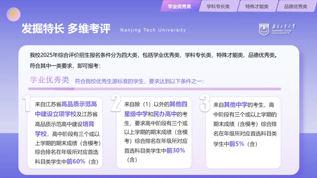 我校2025年综合评价招生报名条件分为四大类,包括学业优秀类、学科专长类、特殊才能类、品德优秀类。符合其中一类要求,即可报考。
