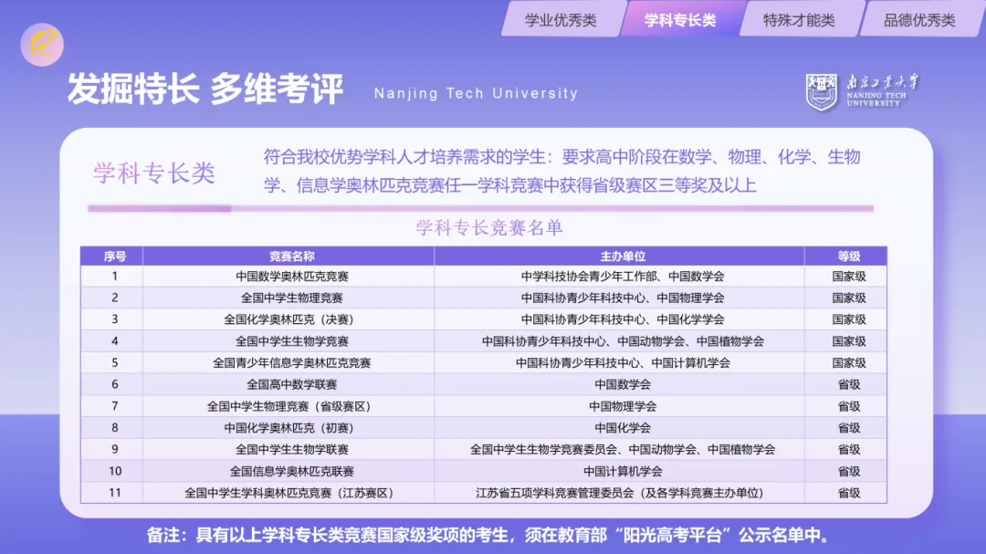 1.学科特长类:高中阶段在自然科学素养类竞赛或人文综合素养类竞赛中获得省级三等奖及以上。