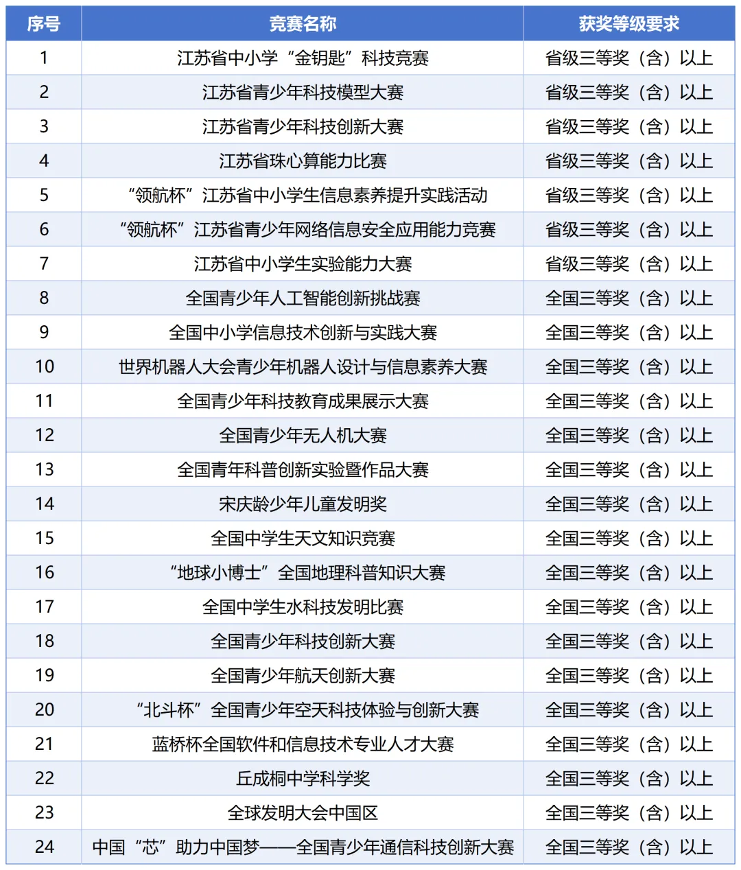 高中阶段在全国青少年人工智能创新挑战赛决赛(中国少年儿童发展服务中心)、全国青少年科技教育成果展示大赛总决赛(中国下一代教育基金会)、全国青年科普创新实验暨作品大赛决赛(中国科协)获得三等奖及以上,或江苏省中小学“金钥匙”科技竞赛(省科协等)、江苏省青少年科技模型大赛(省青少年科技教育协会)、江苏省青少年科技创新大赛(省青少年科技中心)、“领航杯”江苏省中小学生信息素养提升实践活动(省电化教育馆)获得省级一等奖及以上。