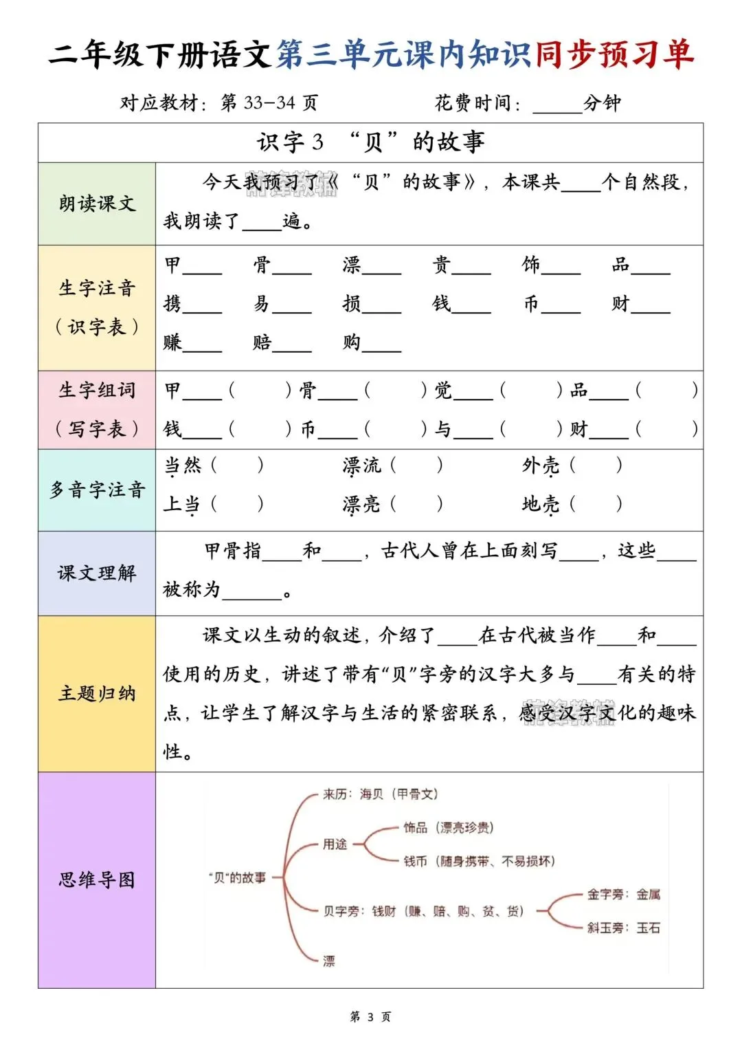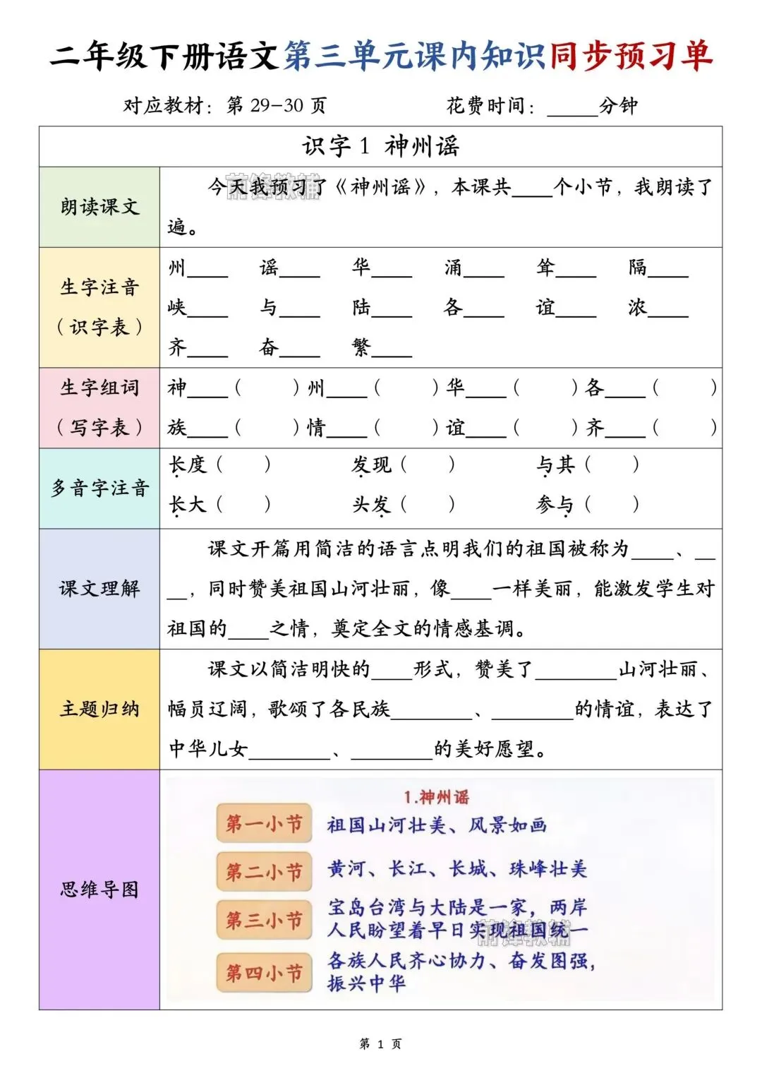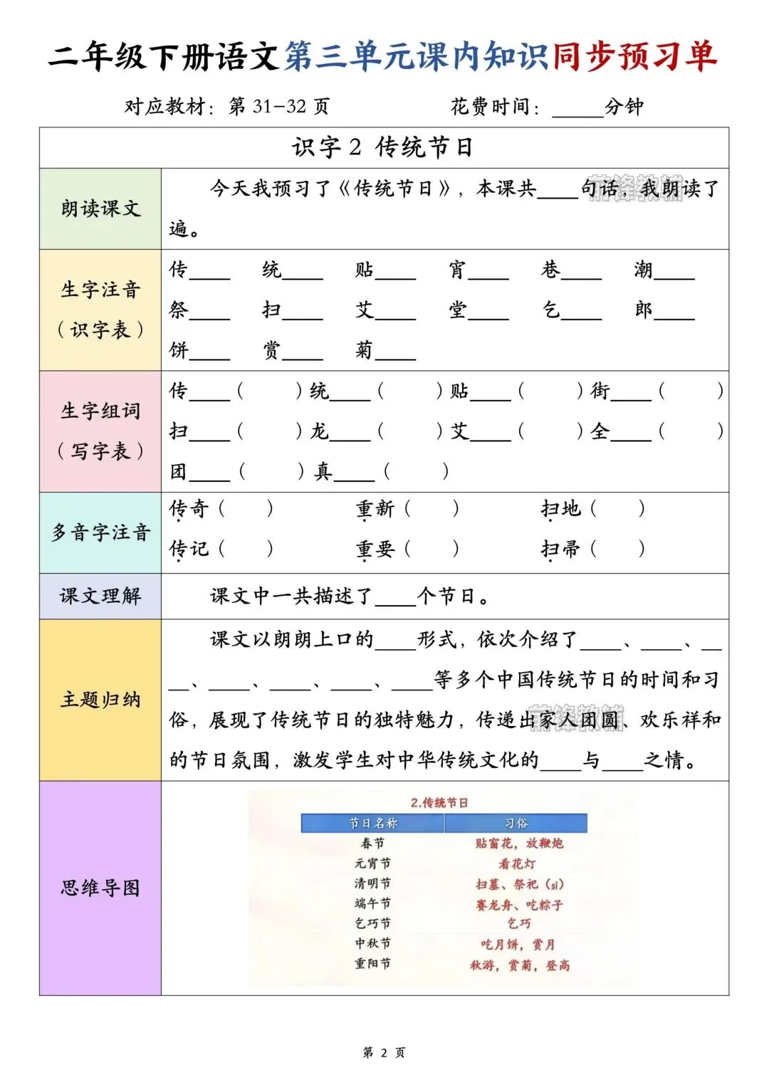 人教版二年级语文下册同步预习单 提前备好做好预习