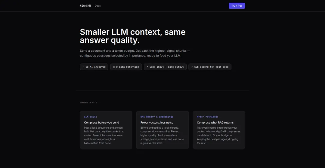 – 长文档问答:当用户需要就一篇很长的技术文档提问时,HighSNR可以预先从文档中提取最相关的段落,并过滤掉无关的章节,然后只将这些精炼的内容传递给LLM进行回答。这解决了LLM处理超长文本时容易“迷失”和响应缓慢的问题。