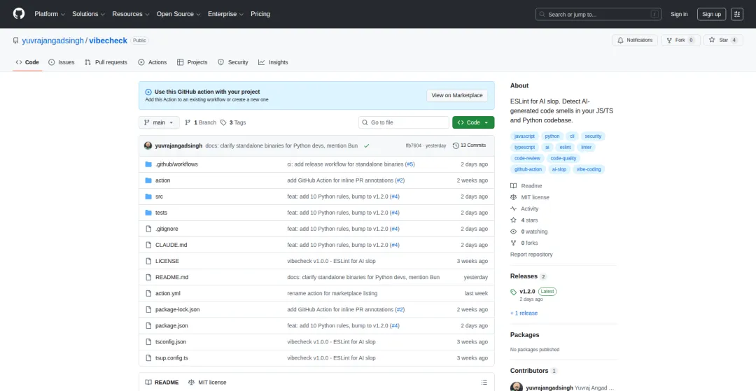 开发者可以将 Vibecheck 作为命令行工具在项目根目录下运行。只需安装(例如通过 npx @yuvrajangadsingh/vibecheck),然后执行 `npx @yuvrajangadsingh/vibecheck .` 即可扫描当前目录下的代码。如果你的项目使用 GitHub Actions 进行持续集成,Vibecheck 也可以集成进去,在代码提交请求(Pull Request)时提供内联的注释和建议。此外,它还提供了独立的二进制文件,这意味着即使你的项目不是 Node.js 生态,也可以直接使用,无需安装 Node.js 环境。