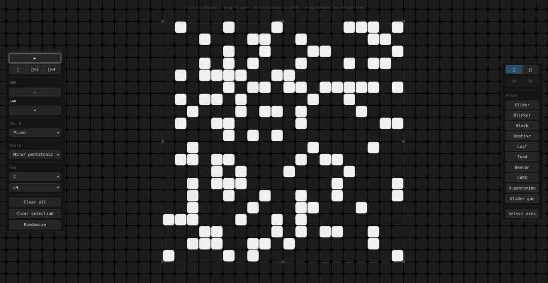 产品介绍: 将康威生命游戏(Conway’s Game of Life)的细胞状态转化为声音,让开发者可以通过听觉来感知和理解这个经典的细胞自动机模型。项目创新之处在于将抽象的计算过程与生动的听觉体验相结合,为理解算法提供了一种全新的视角。