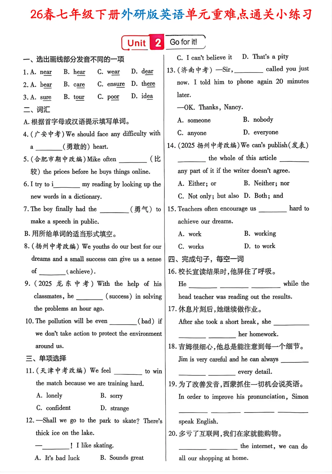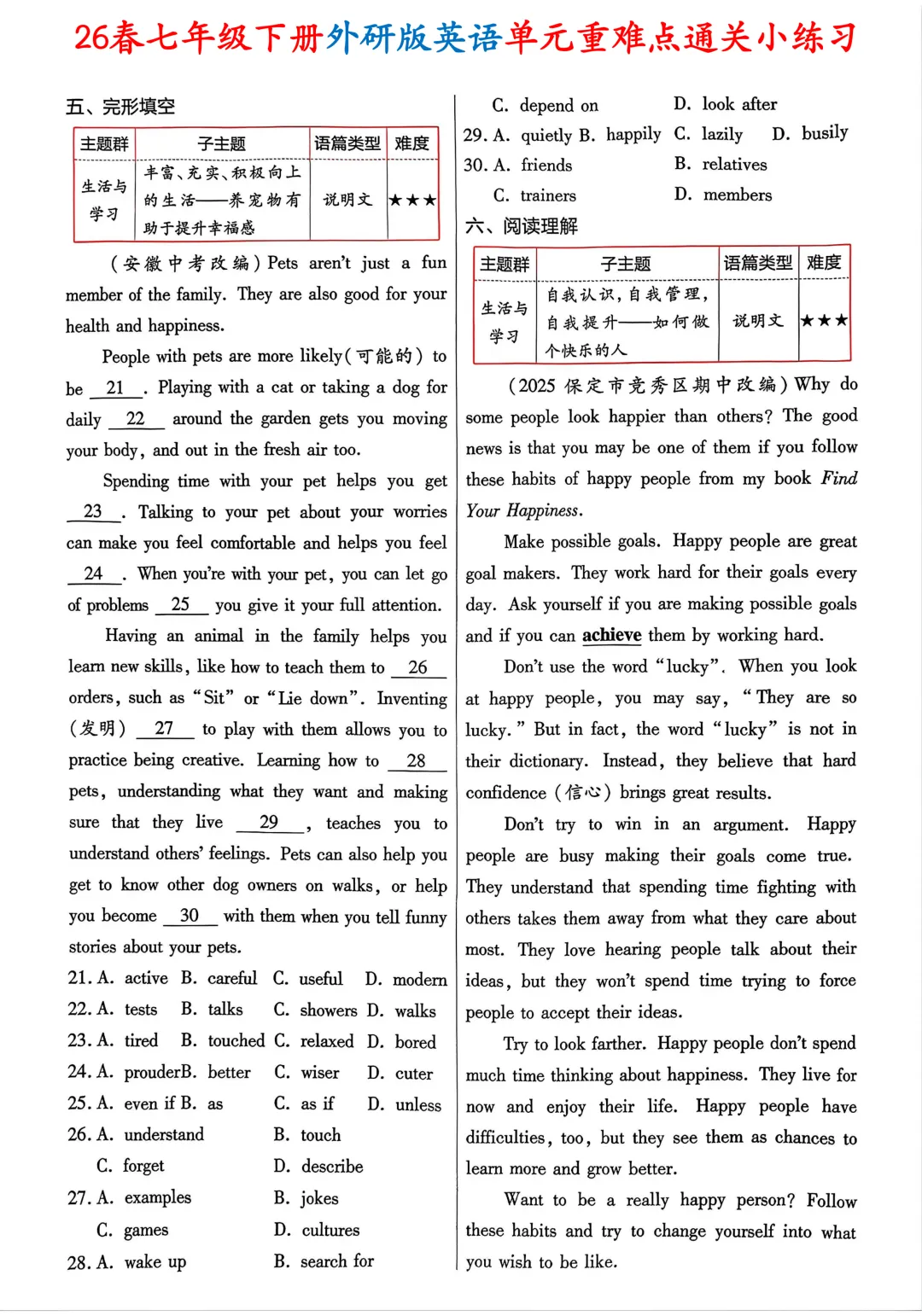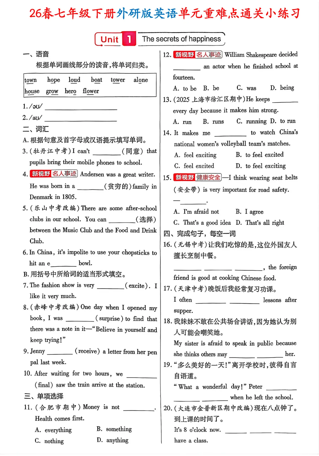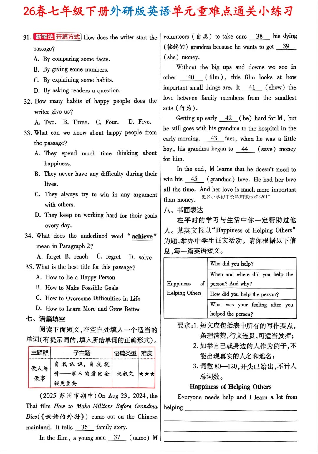 #七年级下册英语#外研版英语#七年级英语#单元重难点#英语小练习#同步练习#含答案#初中英语#单元通关#英语提分#26 春