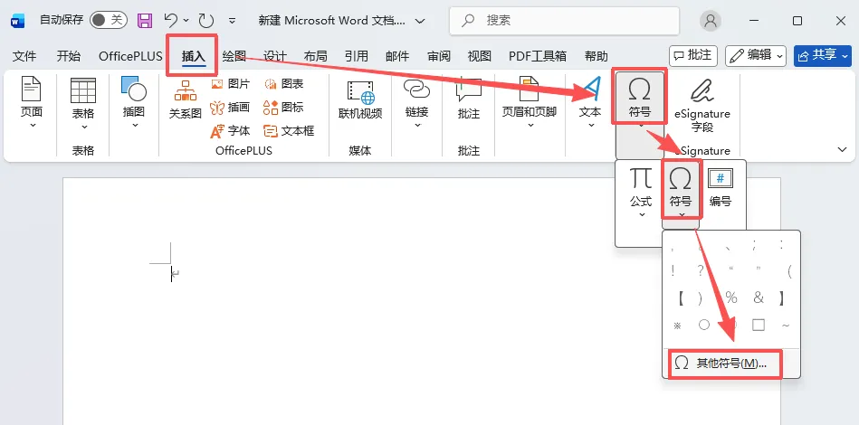 点击最右边的「符号」,再点击「其他符号」,弹出符号窗口