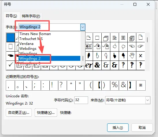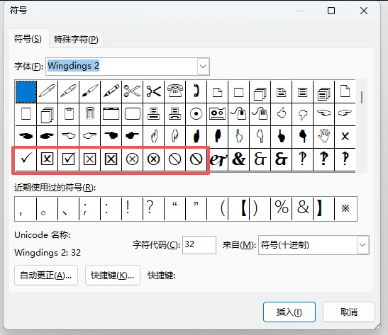 在「字体」下拉里往下滑找到并点击「Wingdings2」,往下翻,就能看到带方框的勾、叉,还有单独的勾、叉