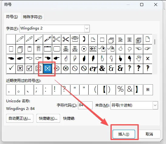 💡小提示:这个方法不管是哪个版本的Word、WPS都能用,找不到符号的话,直接在「字符代码」里输入2611,就能直接定位到带方框的勾,超方便。